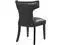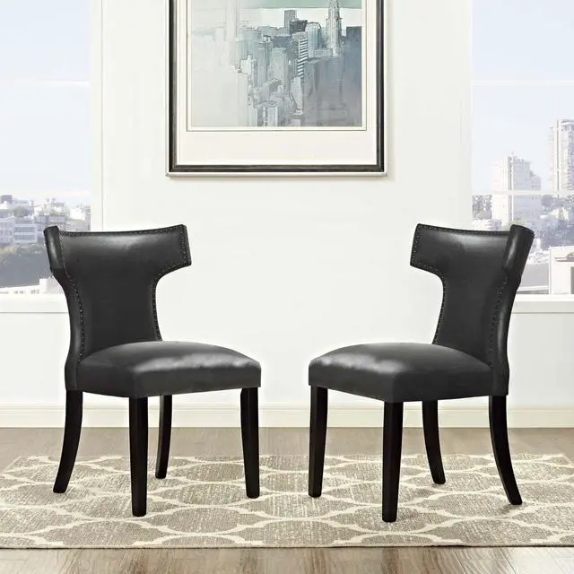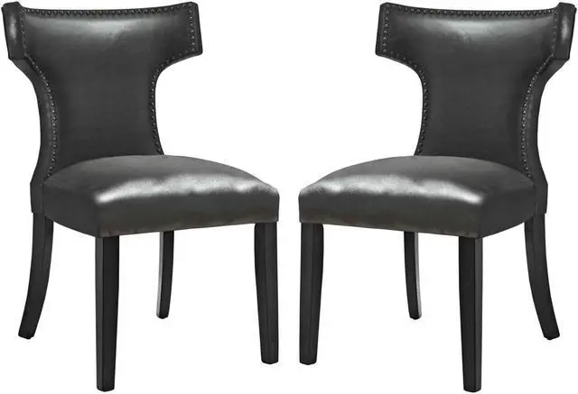 Transform your dining decor with the broadly designed Curve Dining Side Chair. Sweeping lines complement a minimalist shape for a chic look studded with nailhead trim. Curve comes generously padded with dense foam covered in vinyl, non-marking foot caps, and delivers just the right touch of finesse with tapered wood legs. Sporting an hourglass shape, Curve works well in a variety of dining room arrangements.Set Includes:Two - Curve Dining Chair