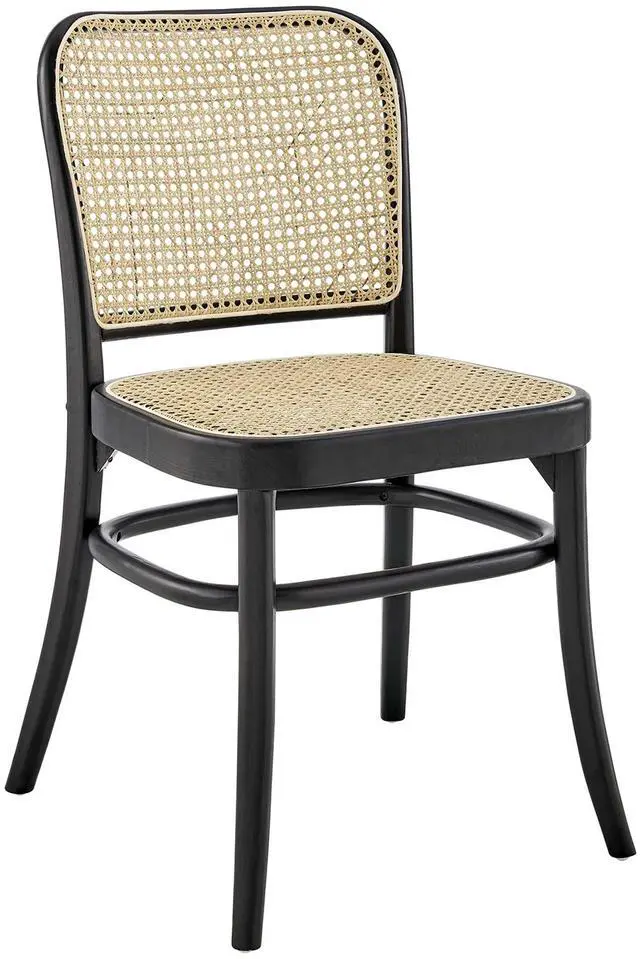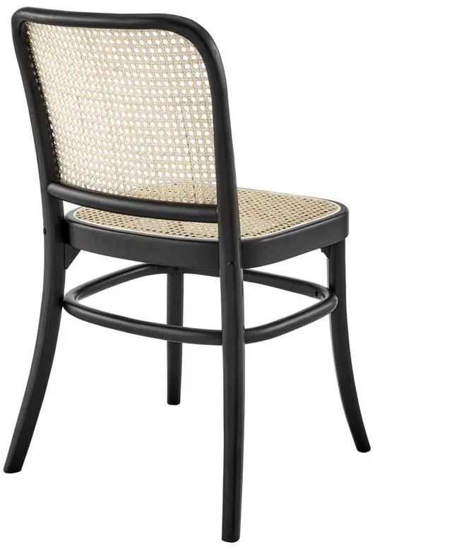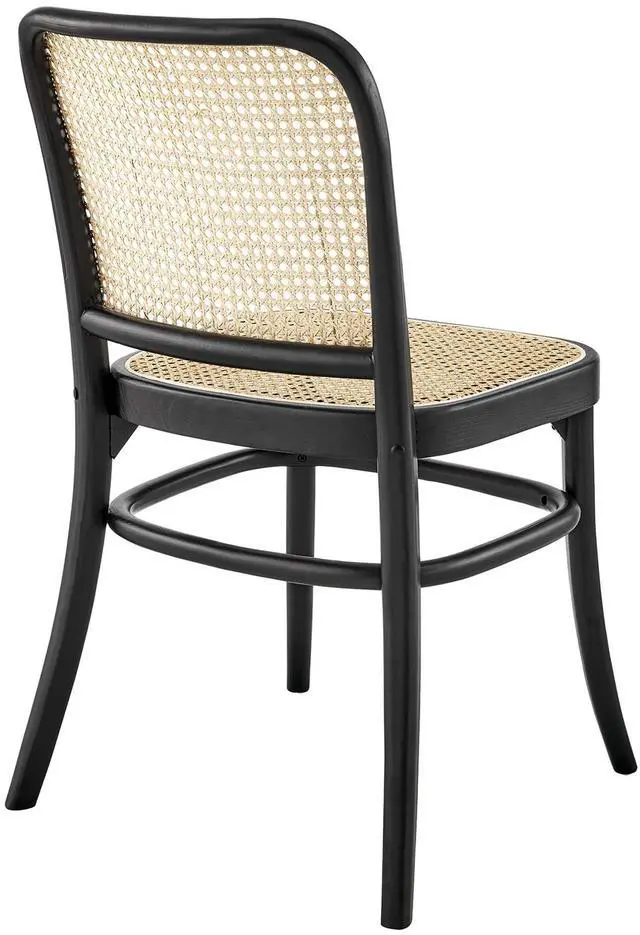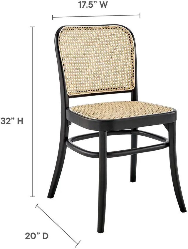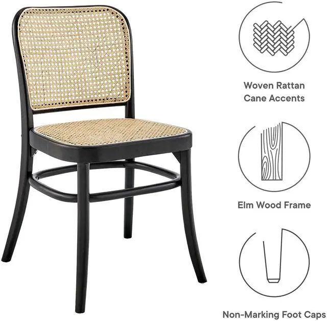 Blend rustic farmhouse charm and coastal serenity in your dining space with the Winona Dining Side Chair. Featuring a woven rattan cane backrest and seat, this dining chair instills vintage modernity around your dining table or as an accent chair in your living space. This dining side chair is complete with a durable elm wood frame with rounded edges and a stretcher for added interest. Includes non-marking foot caps. Weight Capacity: 330 lbs. Set Includes: One - Winona Wood Dining Side Chair