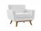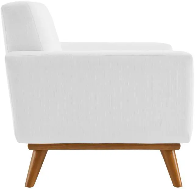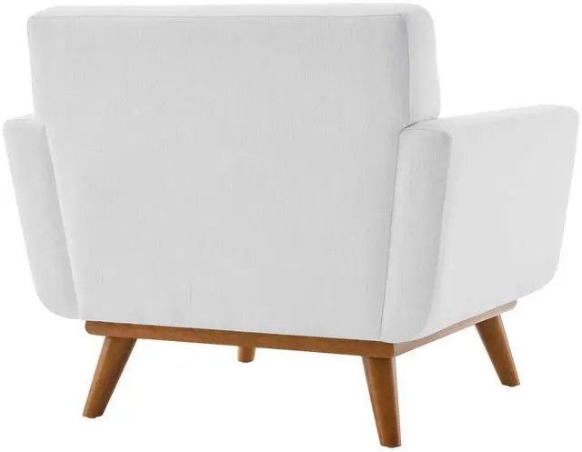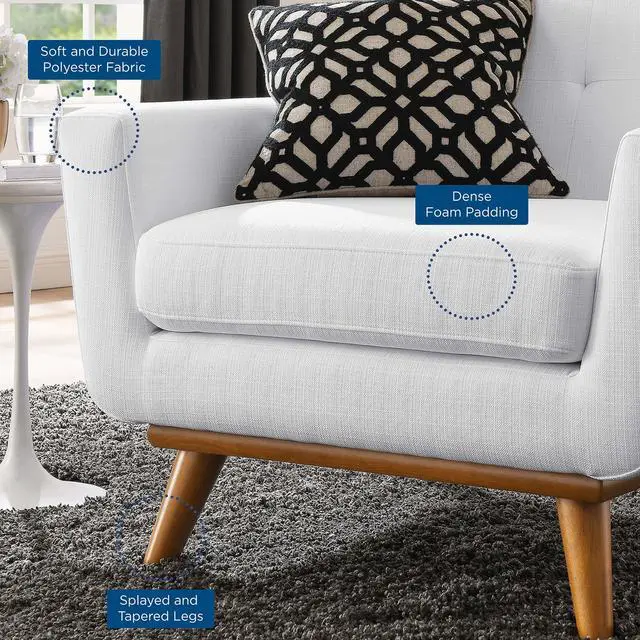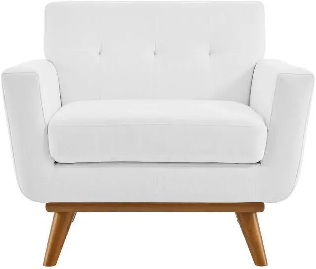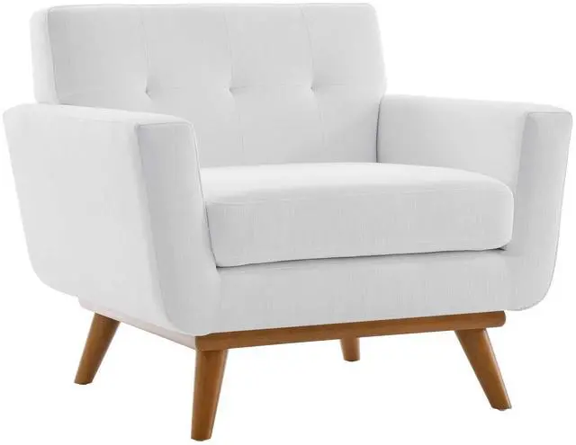 Gently sloping curves and plush seat cushion create a favorite lounging spot. Whether relaxing after a long day at work, settling in with coffee and brunch, or entering a spirited discussion with friends, the Engage Armchair is a welcome presence in your home. Three tufted buttons create eye-catching appeal, adding depth that brings your sitting dcor to center stage. Four cherry color rubberwood legs and frame supply a solid base to the comfortable upholstered material. Set Includes: One - Engage Armchair