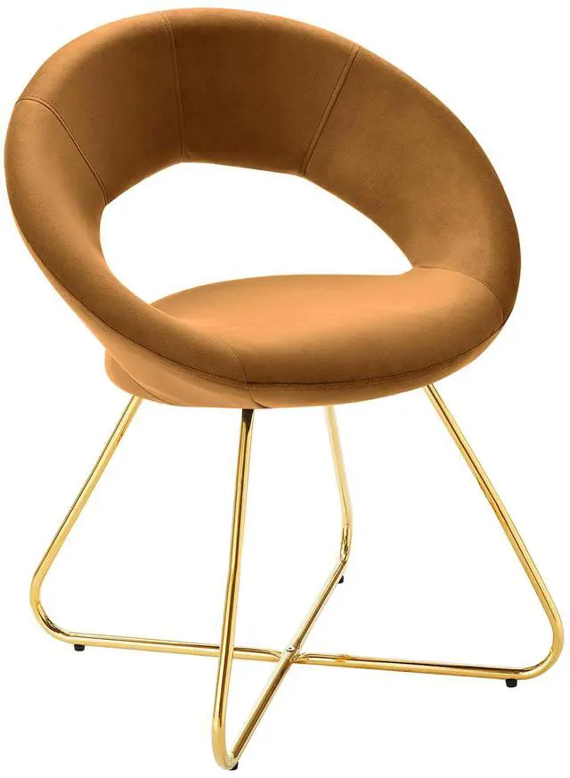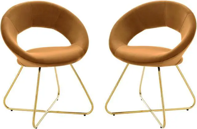 The Nouvelle Performance Velvet Dining Chair Set of Two is a buoyant and intriguing fusion of shapes that energizes your dining space, living room, or bedroom. This beautifully balanced side chair set fits well in modern, contemporary, or minimalist settings. The rounded backrest, upholstered in stain-resistant performance velvet fabric, flows seamlessly into the circular seat cushion for a profoundly satisfying effect. Bolstered by dense foam padding, the contoured seat rests on polished gold hairpin legs, rendering this a whimsical accent chair for your dining room or entryway. Legs are fitted with non-marking foot pins. Set Includes: Two - Nouvelle Performance Velvet Dining Chair