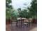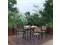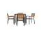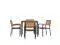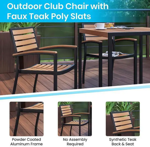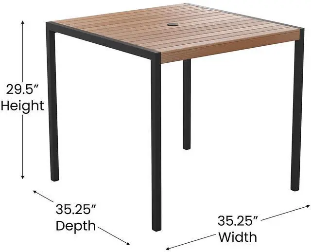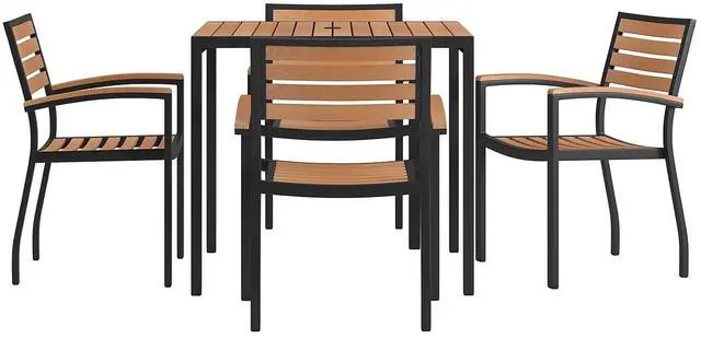 Gain more outdoor dining time at your home or business with this 5 piece 36" square faux teak table and 4 side chairs set. Patrons love to dine al fresco and this all-weather dining set won't disappoint. The trending natural colored synthetic faux teak slats contrast beautifully with the black metal frames and blend seamlessly in almost any decor. Pick the umbrella that suits your personal taste and insert it into the umbrella holder hole to remain cool while outside. Entertain guests at your home or restaurant with this on-trend outdoor seating set. The 18 gauge steel frame of the patio table features metal screw construction that holds up to 300 Lbs. static weight capacity to effortlessly hold your favorite dishes while the 4 patio side chairs boast 12 gauge aluminum frame welded construction that holds up to 300 Lbs. static weight capacity to accommodate most users. Powder coating helps resist nicks and scratches on all pieces and is weather-resistant for year-round use though care should be taken to protect from prolonged periods of wet weather. The stackable chairs arrive fully assembled and ready to use and may be stacked up to 15 high for storage or routine floor care while the table assembles in 30 minutes or less with the included step-by-step instructions to refresh your outdoor dining space in your home or restaurant. Clean your new outdoor dining set with a water based cleaner to maintain great looks. Fixed glides will maintain the appearance of your hard flooring surfaces when being used indoors.