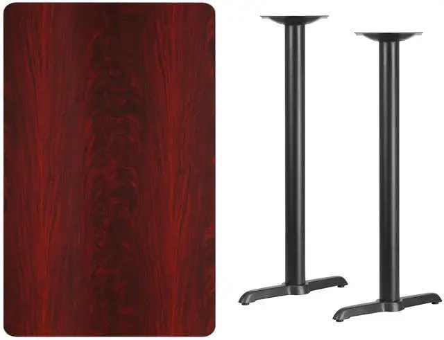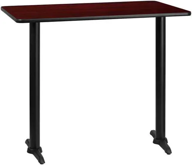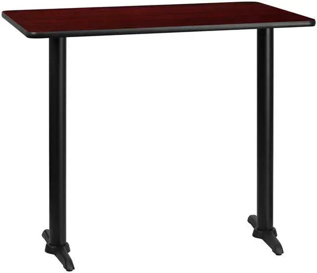 Complete your restaurant, break room or cafeteria with this bar height table top and base configuration. This set is designed for commercial use to withstand the daily rigors in the hospitality industry. This set will also make a great option for your home as a dining table or in the rec room. The reversible black or mahogany top allows you to choose your color of choice and then affix to the base. Surface is heat, scratch and moisture resistant. Use a mild detergent and water, dry clean to keep your tables spotless. Whether you are just starting your business or upgrading your furniture this bar table set will complete the look.Product Dimension-30"W x 48"D x 43.125"H