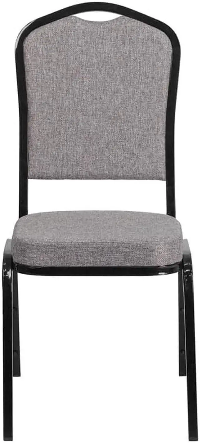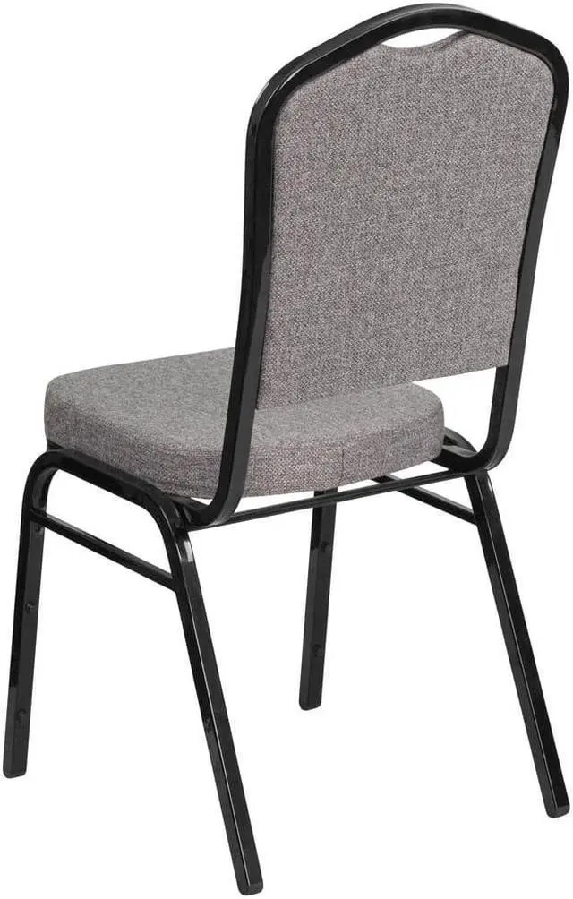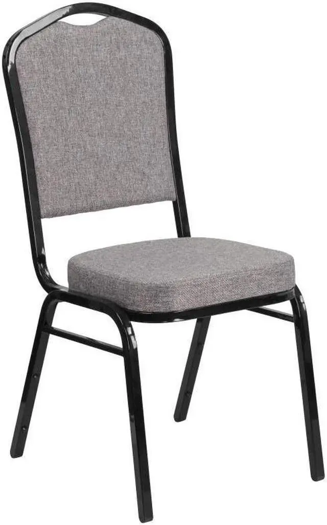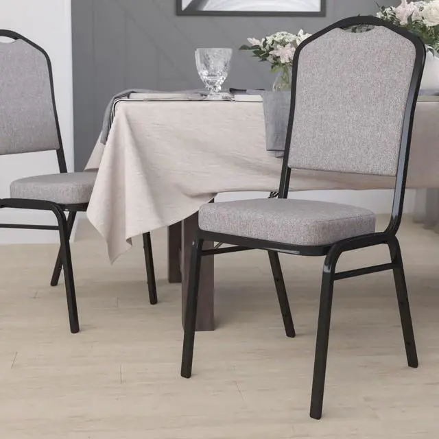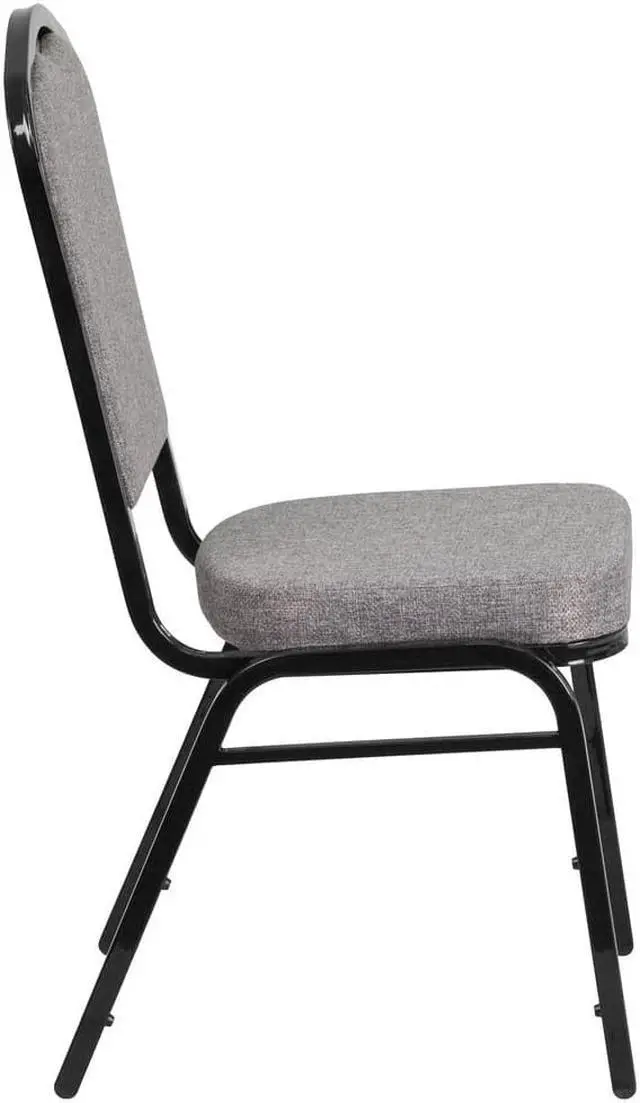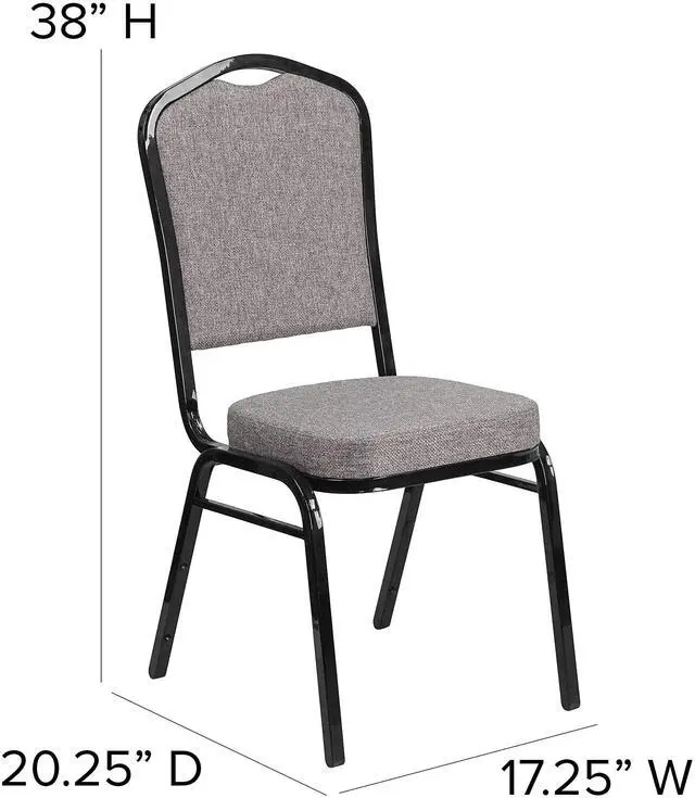 Make an impressive presentation in your banquet hall when clients come to visit your facility with these ballroom chairs. Built for the commercial industry these popular crown back banquet chairs have been tested to hold up to 500 pounds. With a high seating capacity these stack chairs are perfect for the event rental business. This standout hospitality chair can be used as is and still command attention or be dressed up for formal events by placing a chair cover over it. The chair is cushioned with 2.5" thick CAL 117 fire retardant foam and is covered in durable upholstery for high usage. The sturdy frame with gracefully angled legs are made of 16 gauge steel in a lasting powder coated finish. Double support braces reinforce the frame to give it great strength and durability. Bumper guards prevent scratches on the frame when stacked (up to 15 high) and non-marring floor glides protect your floor by sliding smoothly when you need to move the chair. This multi-use stacking upholstered stack chair is an excellent option for churches, banquet halls, training rooms, hotels, convention centers and schools. Add banquet chairs to your home dining table to add a contrasting look to your dining room or kitchen.Product Dimension-17.25"W x 20.25"D x 38"H