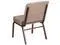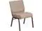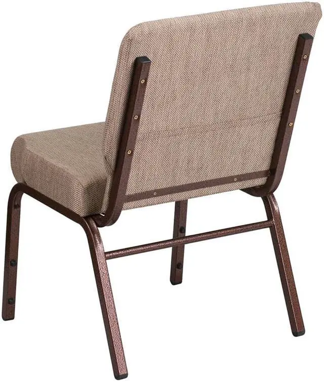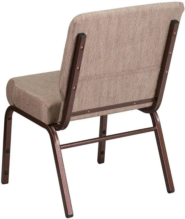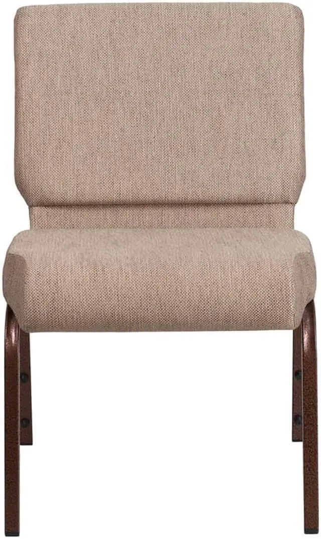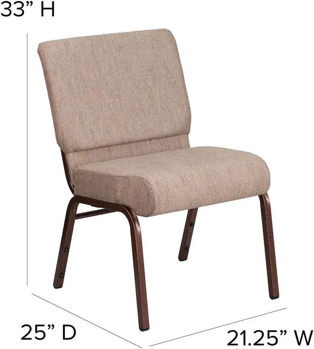 This beautiful, supremely comfortable padded chair will ensure your guests have an enjoyable experience whether you're hosting an all-day seminar, serving a 10 course meal or delivering your most inspirational sermon. Unlike pew seating, these chairs give you the capability to create different seating configurations making them an ideal seating solution for any venue. The upholstered stack chair with 4" thick seat are generously padded and covered in durable fabric upholstery. The spacious, 21" wide seat has a waterfall edge that provides an extra level of comfort by reducing pressure on your attendees' legs. A convenient book pouch on the back of the chair keeps seminar materials, bibles or hymn books readily available. Its sturdy 16 gauge steel, copper vein frame, with gracefully angled legs, has been tested to hold up to 800 pounds and plastic rocker glides protect your floor by sliding smoothly when you need to move the chair. This commercial side chair is stackable for easy storage making it an excellent choice for event venues, hotel lobbies, banquet halls, conference facilities and worship centers.Product Dimension-21.25"W x 25"D x 33"H
