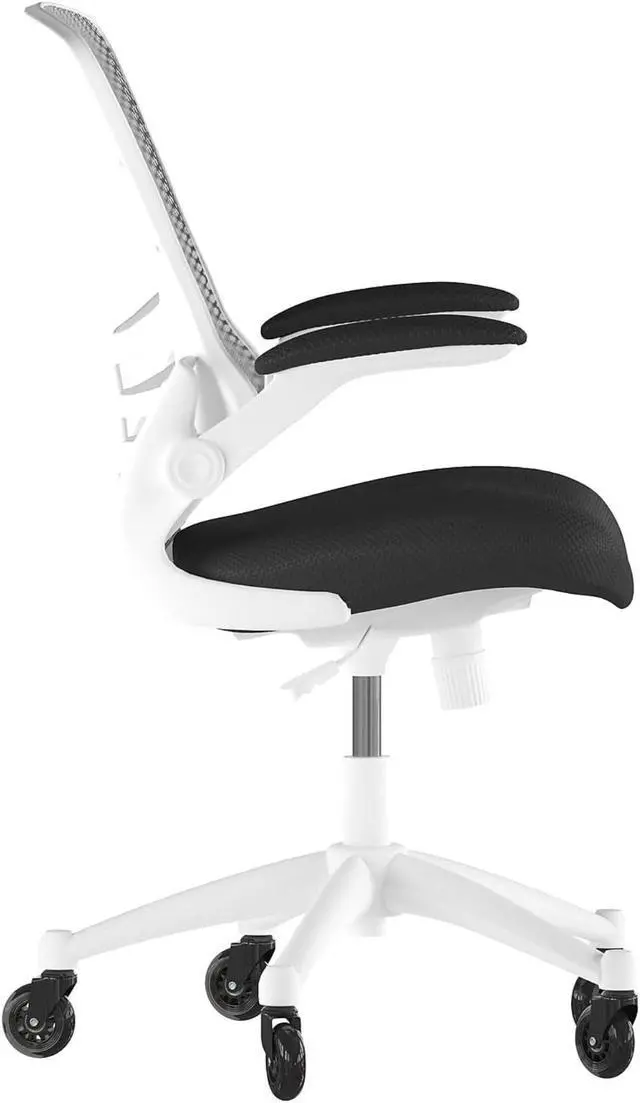 Whether you're working or gaming, be completely comfortable in this ergonomic mesh back chair that features transparent, breathable mesh across the back allowing air to circulate to keep you cool. Built-in lumbar support improves your posture and helps prevent back strain and muscle fatigue. Padded flip-up armrests relieves pressure from your shoulders and neck and rotate 90 degrees out of the way so you can move this mesh task chair closer to your desk. The contoured seat is padded with 3" of foam and covered with black mesh upholstery. A true asset in any space, this computer chair boasts a contrasting white frame and 360 degree swivel capability paired with transparent rubber skate style wheels with ball bearing motion to access multiple surfaces without strain. The pneumatic seat height adjustment lever allows the seat to raise and lower to each individual's needs. Turn the tilt tension adjustment knob to increase or decrease the amount of force needed to rock or recline. Don't worry about spills from your morning coffee or the lunch you ate at your desk, this mesh office chair with lumbar support cleans easily with a solvent base cleaner, no water needed. Whether it's a day filled with meetings, home office paperwork or marathon gaming sessions, this stylish mid-back mesh swivel task chair with upgraded polyurethane tires will keep you cool and comfortable throughout your busy day.