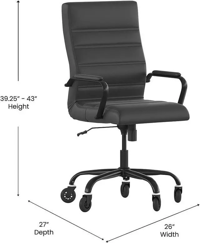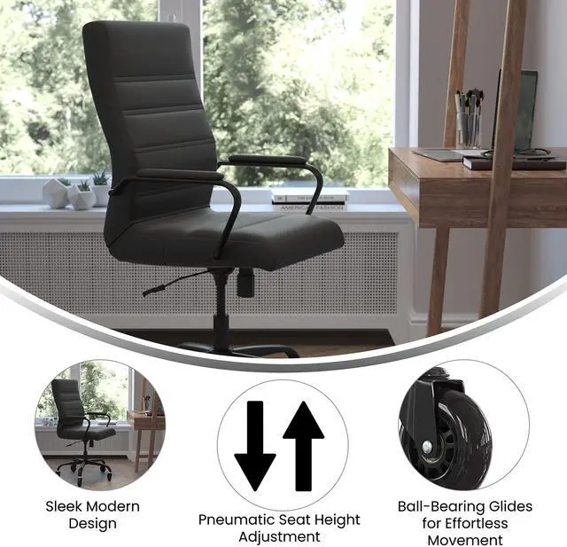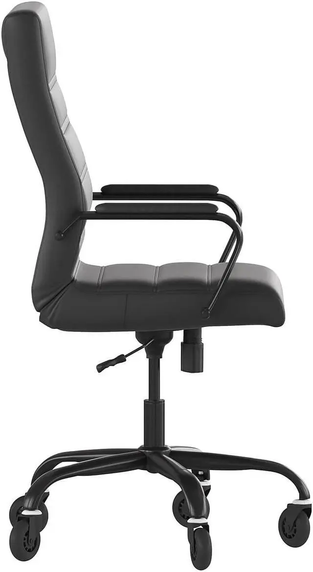 Comfort and style abound in this high-back LeatherSoft office chair with a complementary black frame and updated ball-bearing roller style wheels making it the perfect seating solution for your workspace. Crafted from premium materials, the ergonomic design brings a sleek look with ample durability and support for long-term use. Designed for exceptional comfort, this computer desk chair features a LeatherSoft upholstered, cushioned seat and back with padded arms for additional comfort. Horizontal stitching along the seat and back adds a touch of refinement that appeals in any space. The high-back office chair features extended height to support your upper back and help relieve back tension. A waterfall front seat edge removes pressure on your lower legs. Complete your custom fit with the pneumatic seat height adjustment lever and a tilt-lock mechanism for a rocking and reclining motion. Easily maneuver through a variety of tasks with the full 360-degree swivel seat atop transparent polyurethane roller style wheels with smooth ball-bearing motion. The classic styling pairs effortlessly with any office decor style, creating a comfortable and elegant impression that's perfect for residential or corporate workspaces.