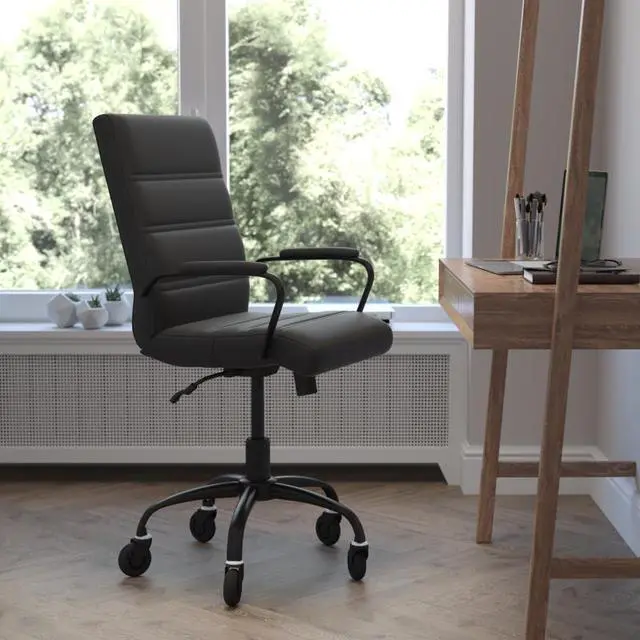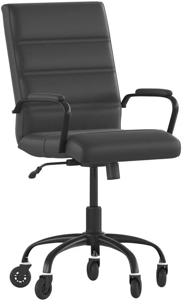 Comfort and style abound in this mid-back LeatherSoft office chair with a complementary black frame and updated ball-bearing roller style wheels making it the perfect seating solution for your workspace. Crafted from premium materials, the ergonomic design brings a sleek look with ample durability and support for long-term use. Designed for exceptional comfort, this computer desk chair features a LeatherSoft upholstered, cushioned seat and back with padded arms for additional comfort. Horizontal stitching along the seat and back adds a touch of refinement that appeals in any space. The mid-back office chair support for your mid to upper back and helps relieve back tension. A waterfall front seat edge removes pressure on your lower legs. Complete your custom fit with the pneumatic seat height adjustment lever and a tilt-lock mechanism for a rocking and reclining motion. Easily maneuver through a variety of tasks with the full 360-degree swivel seat atop transparent polyurethane roller style wheels with smooth ball-bearing motion. The classic styling pairs effortlessly with any office decor style, creating a comfortable and elegant impression that's perfect for residential or corporate workspaces.