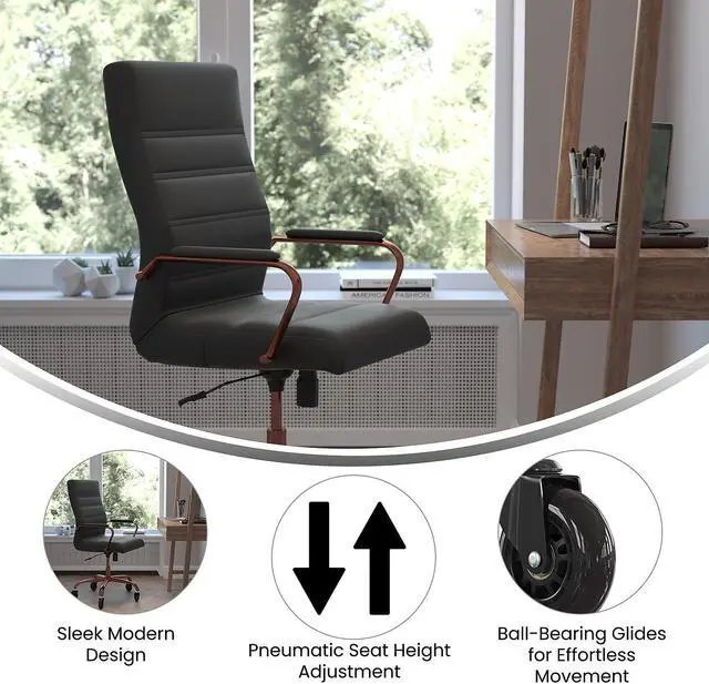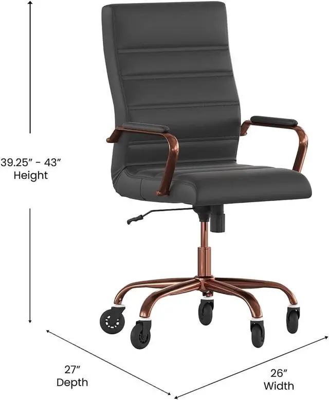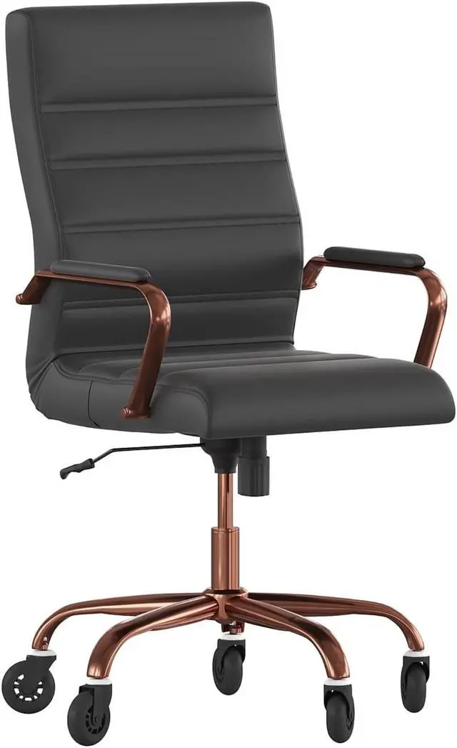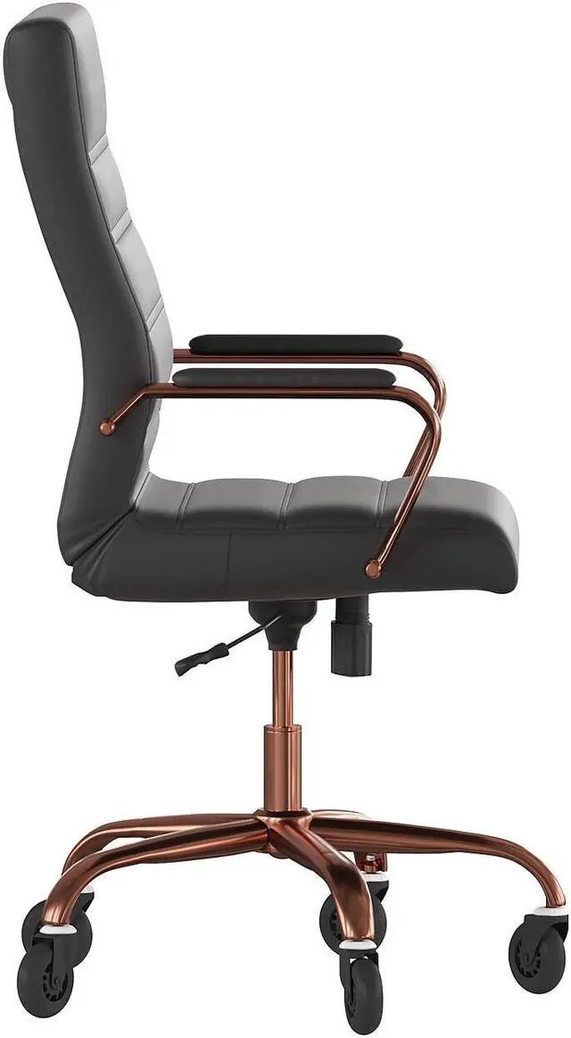 Comfort and style abound in this high-back LeatherSoft office chair with a contrasting rose gold frame and updated ball-bearing roller style wheels making it the perfect seating solution for your workspace. Crafted from premium materials, the ergonomic design brings a sleek look with ample durability and support for long-term use. Designed for exceptional comfort, this computer desk chair features a LeatherSoft upholstered, cushioned seat and back with padded arms for additional comfort. Horizontal stitching along the seat and back adds a touch of refinement that appeals in any space. The high-back office chair features extended height to support your upper back and help relieve back tension. A waterfall front seat edge removes pressure on your lower legs. Complete your custom fit with the pneumatic seat height adjustment lever and a tilt-lock mechanism for a rocking and reclining motion. Easily maneuver through a variety of tasks with the full 360-degree swivel seat atop transparent polyurethane roller style wheels with smooth ball-bearing motion. The classic styling pairs effortlessly with any office decor style, creating a comfortable and elegant impression that's perfect for residential or corporate workspaces.