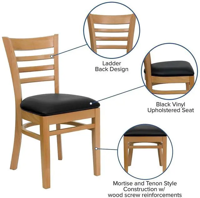 Create a first-rate dining experience by offering your patrons great food, service and attractive furnishings. This classic natural wood chair will offer guests a warm, inviting look when entering your establishment. This chair will make an attractive addition to your restaurant, lounge, bar or other high traffic venue. This chair is easy to clean, which is an important aspect when it comes to a business. This chair was designed to withstand the daily rigors in the hospitality industry, but will also provide a cozy, intimate quality to your home. The ladder back design and thickly padded, black vinyl upholstered seat will keep your guests comfortable. The durable frame is stabilized with mortise and tenon construction with metal wood screw reinforcements and a curved support bar for extra stability. The floor glides help protect your floors and ensure smooth gliding. This charmingly styled chair is a must have, whether used in the home or your commercial business.Product Dimension-17.5"W x 20"D x 33.75"H