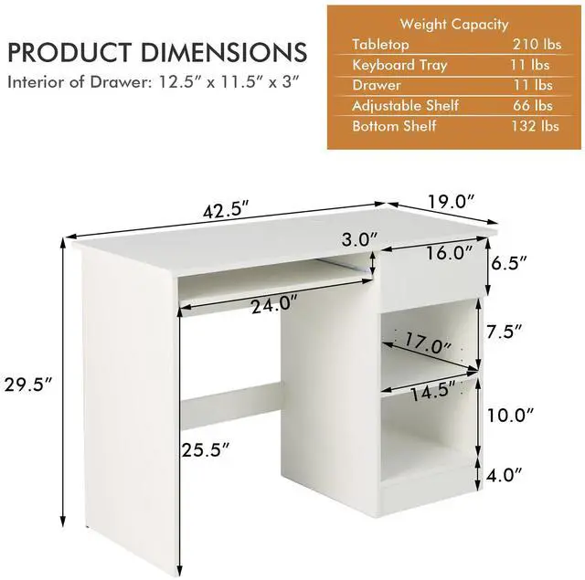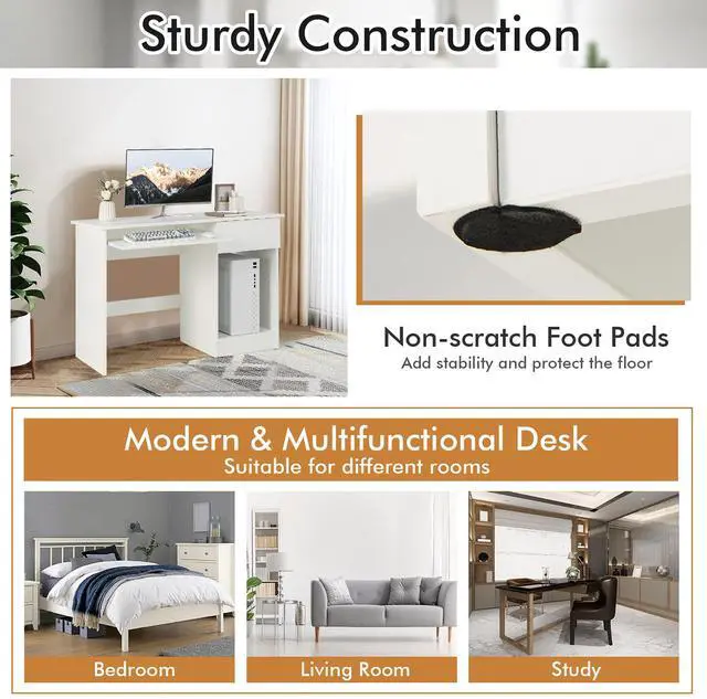 The multifunctional computer desk integrates a keyboard tray, a pull-out drawer and 2 tier open shelves for an orderly arrangement of your work supplies. Whats more, the upper shelf is adjustable in height for storing different items. And if you want to put the computer host aside, you can remove the upper shelf to make the bottom shelf a CPU stand. Besides, the spacious tabletop is equipped with a cable management hole for an overall tidy look. Whats also worth mentioning is that we attach great importance to details. For example, the non-scratch foot pads improve the stability and protect the floor, while the white stickers help cover the screw holes.