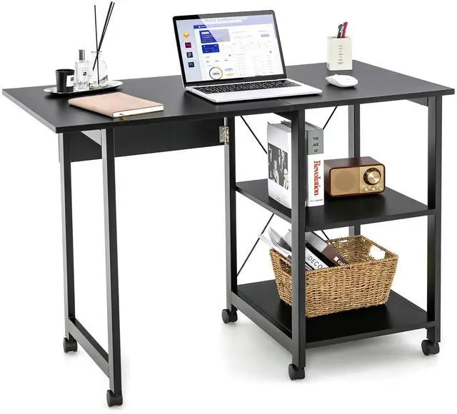 Consisted of high-quality MDF and sturdy steel frame, our writing desk is stable and sturdy enough to support a long service life. Equipped with a spacious desktop and 2-tier open storage shelves, this desk provides large space to store your daily items and office supplies, making your working or studying area neat and tidy. And you can easily fold the desk to use it as a side table or bedside table. Moreover, equipped with 6 universal casters, 3 of them with brakes for fix ing, the desk can be moved to anywhere conveniently. With a simple and modern design, this writing desk will fit well with any home decoration and bring elegance to your house.