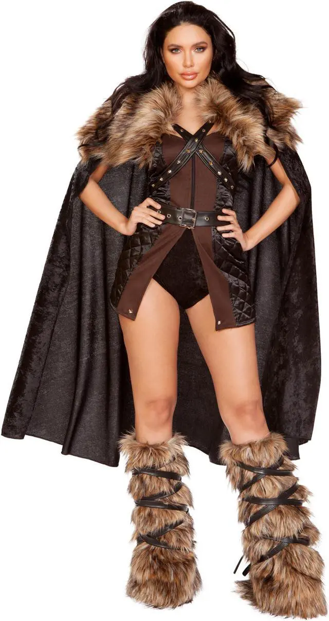 4pc Northern Warrior - 4896-AS-M Includes Front slit Dress with Zipper Closure, Belt, Velvet Shorts, & Cape with Faux Fur Detail and Tie Strap with Stud Accents
