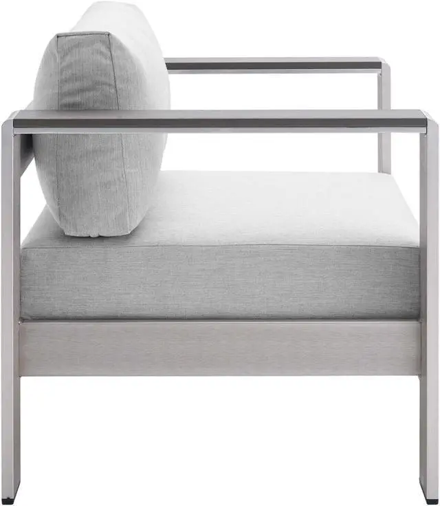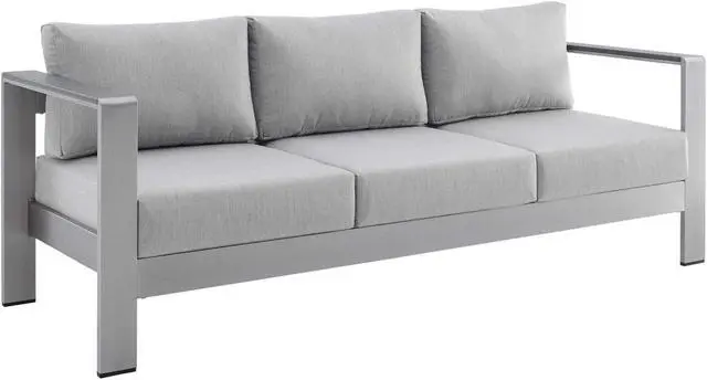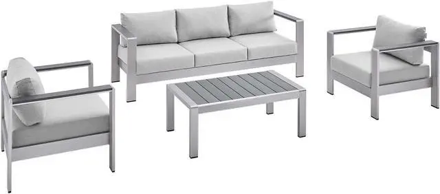 Enjoy your patio or backyard leisure time with the strong and durable Shore Aluminum 4 Piece Outdoor Patio Furniture Set. Made with anodized brushed aluminum frames and non-marking black plastic foot caps, Shore comes outfitted with resilient Sunbrella fabric canvas cushions tested to last through all weather conditions. The Shore Outdoor Aluminum Outdoor Patio Set complements your casual gatherings with a look and functionality you can rely on. Set Includes: 1 Sofa, 2 Armchairs, 1 Coffee TableSet Includes:One - Shore Coffee TableOne - Shore SofaTwo - Shore Armchair