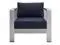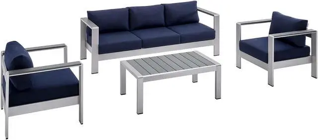 Enjoy your patio or backyard leisure time with the strong and durable Shore Aluminum 4 Piece Outdoor Patio Furniture Set. Made with anodized brushed aluminum frames and non-marking black plastic foot caps, Shore comes outfitted with resilient Sunbrella fabric canvas cushions tested to last through all weather conditions. The Shore Outdoor Aluminum Outdoor Patio Set complements your casual gatherings with a look and functionality you can rely on. Set Includes: 1 Sofa, 2 Armchairs, 1 Coffee TableSet Includes:One - Shore Coffee TableOne - Shore SofaTwo - Shore Armchair