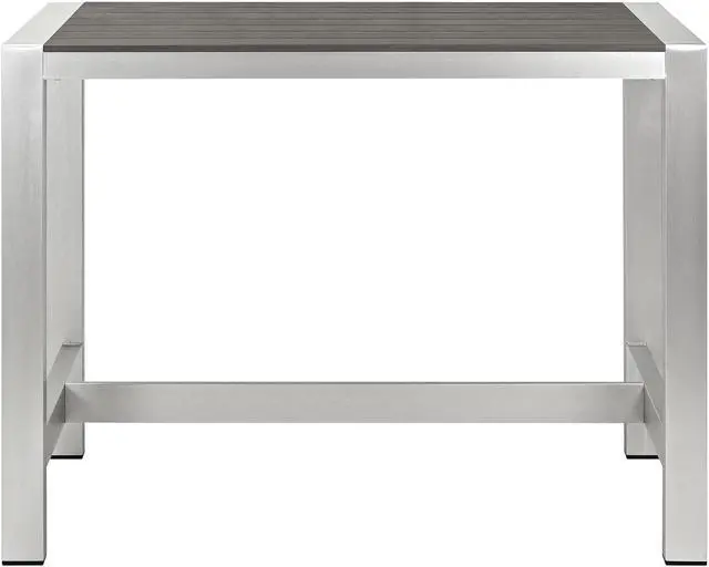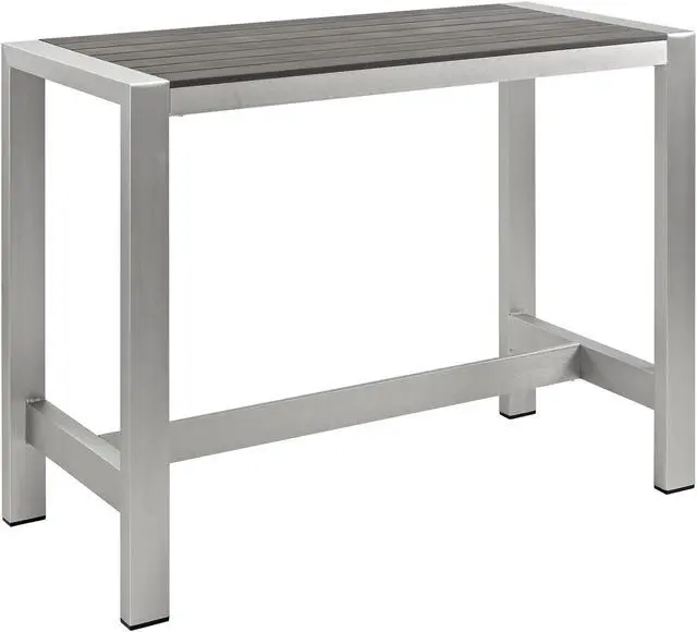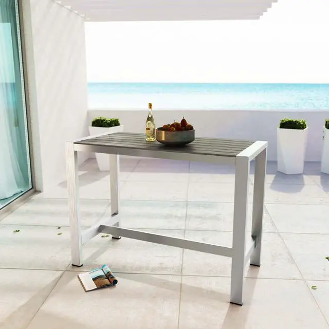 Enjoy your patio or backyard leisure time with the strong and durable Shore Outdoor Aluminum Bar Table. Made with an anodized brushed aluminum frame and non-marking black plastic foot caps, Shore features tone-on-tone grays with wood accents on the paneling for a chic and minimalist look. The Shore Outdoor Aluminum Dining Bar Table complements your casual gatherings with a look and functionality you can rely on.
