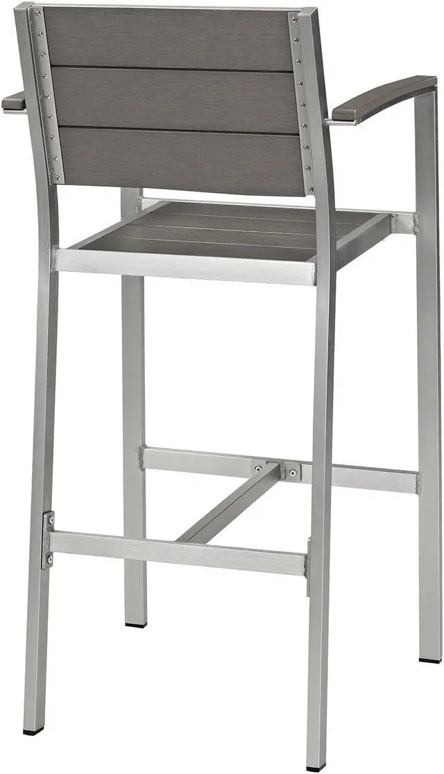 Enjoy your patio or backyard leisure time with the strong and durable Shore Outdoor Aluminum Bar Stool. Made with an anodized brushed aluminum frame, sturdy footrest, and non-marking black plastic foot caps, Shore features tone-on-tone grays with wood accents on the paneling for a chic and minimalist look. The Shore Outdoor Aluminum Dining Bar Stool complements your casual gatherings with a look and functionality that you can rely on.