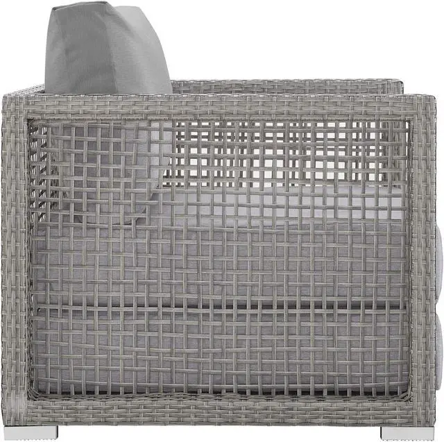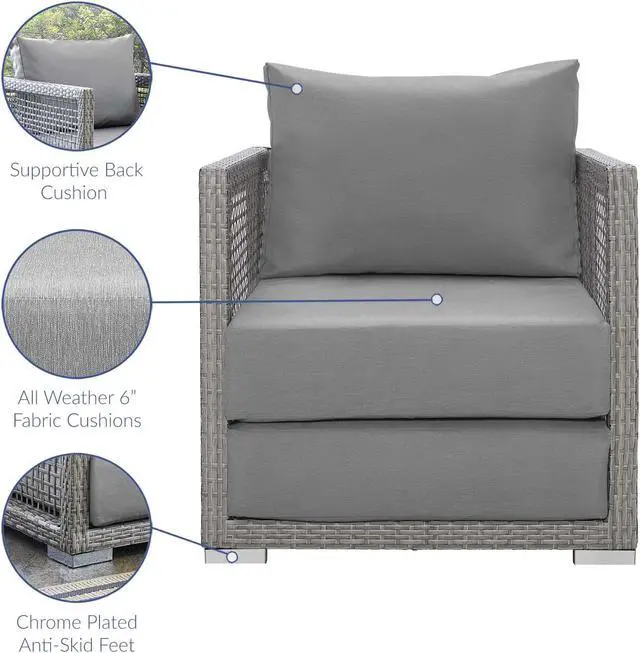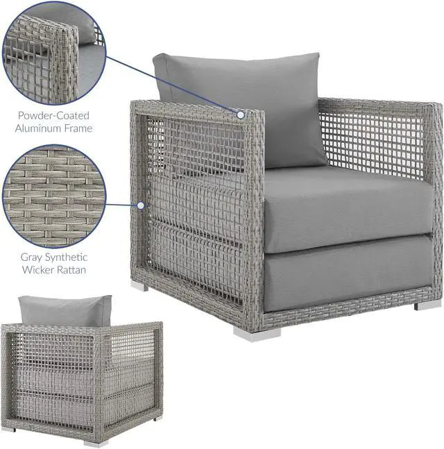 Weave conversational threads into a rollicking good time with Aura Outdoor Patio Armchair. Aura comes with a synthetic gray-on-gray tone wicker rattan weave and a powder-coated aluminum frame that delivers a softly versatile outdoor collection that shifts to meet the needs of the moment. Outfitted with machine washable and fade resistant all-weather fabric cushions, and designed with an extra wide and deep body, Aura will make your outdoor spot the focal point of good memories and festive gatherings while enhancing your patio, backyard or poolside arena. Featuring thick cushions and chrome plated anti-skid feet, enjoy spacious seating and enhanced comfort with this reliable piece of outdoor furniture.