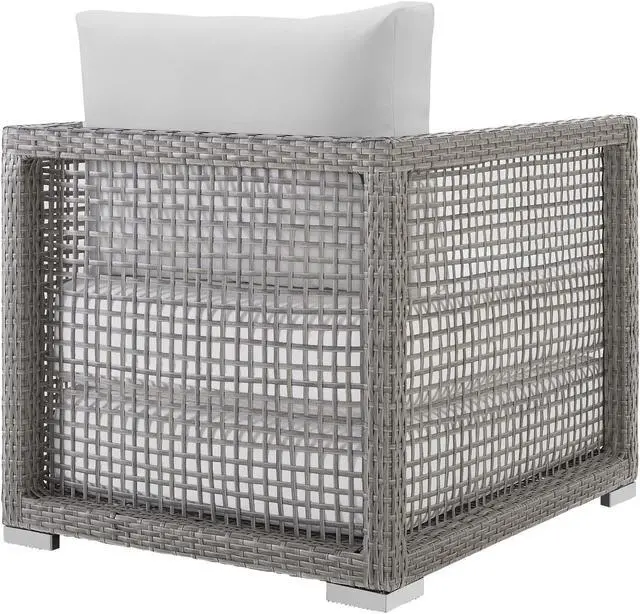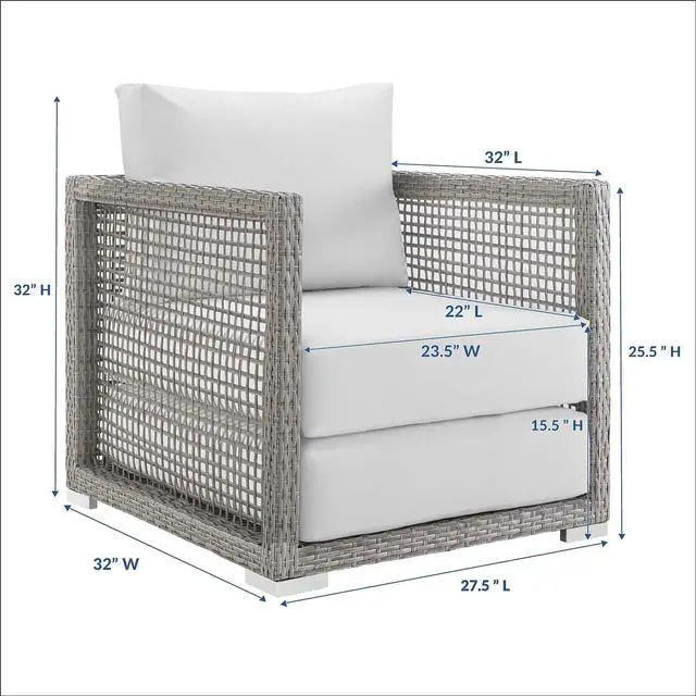 Weave conversational threads into a rollicking good time with Aura Outdoor Patio Armchair. Aura comes with a synthetic gray-on-gray tone wicker rattan weave and a powder-coated aluminum frame that delivers a softly versatile outdoor collection that shifts to meet the needs of the moment. Outfitted with machine washable and fade resistant all-weather fabric cushions, and designed with an extra wide and deep body, Aura will make your outdoor spot the focal point of good memories and festive gatherings while enhancing your patio, backyard or poolside arena. Featuring thick cushions and chrome plated anti-skid feet, enjoy spacious seating and enhanced comfort with this reliable piece of outdoor furniture.
