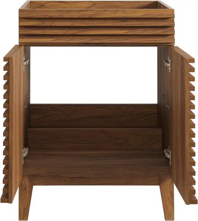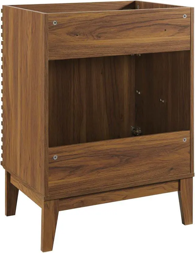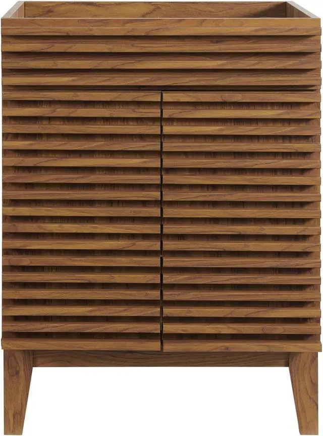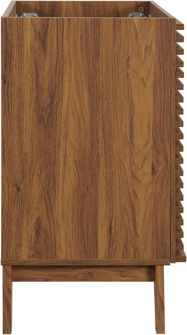 Tap into mid-century aesthetics with the Render Vanity. Render Bathroom Vanity features a durable MDF and particleboard frame with smooth walnut grain laminate, four tapered wood legs, and adjustable storage shelf behind two soft-close hinged doors. Sleek lines and crisp design align for an edgy style designed to meet your needs. Boasting a mid-century modern style this vanity features a solid construction with a pleasing look and practical functionality. Assembly required and sink basin not included.Set Includes:One - Render Bathroom Vanity Cabinet (Sink Basin Not Included)