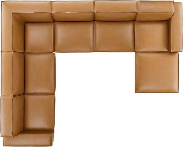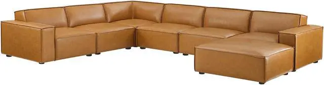 Create your custom living room and lounge area with the Restore Vegan Leather 7-Piece Sectional Sofa. The Restore Sectional Sofa appeals to minimalist elegance with a crisp design and broad lines accented with French piping details and vegan leather upholstery. Dense foam padding and a pocket coil spring system in the cushions offer a luxe seating experience for your living room and lounge. The Restore Living Room Sectional Sofa is solidly constructed from plywood and wood with non-marking foot caps to protect flooring and connectors between modular pieces. Each Piece Weight Capacity: 440 lbs.Set Includes:One - Restore Left-Arm Sectional Sofa ChairOne - Restore OttomanOne - Restore Right-Arm Sectional Sofa ChairOne - Restore Sectional Sofa Corner ChairThree - Restore Sectional Sofa Armless Chair