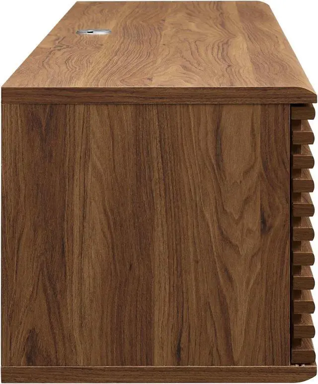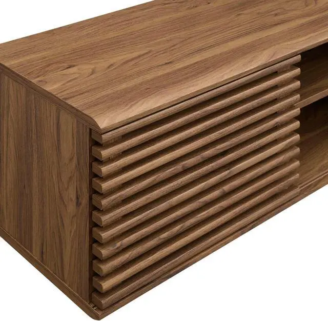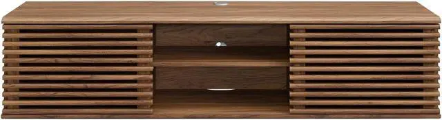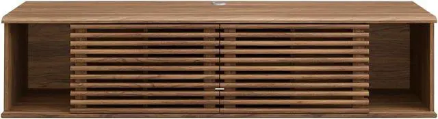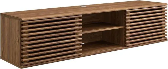 Tap into mid-century aesthetics with the Render 60" Wall-Mount TV Stand. This installment of the Render collection features a durable particleboard frame with smooth walnut grain laminate, an adjustable center shelf, two cable management holes, and two sliding doors for concealed shelf storage. Mounting directly to the wall, this versatile mid-century modern living room table features a solid construction with a pleasing look and practical functionality. Perfect for media storage, Render accommodates flat-screen TVs up to 65" wide.Set Includes:One - Render 60" Wall-Mount Media Console TV Stand