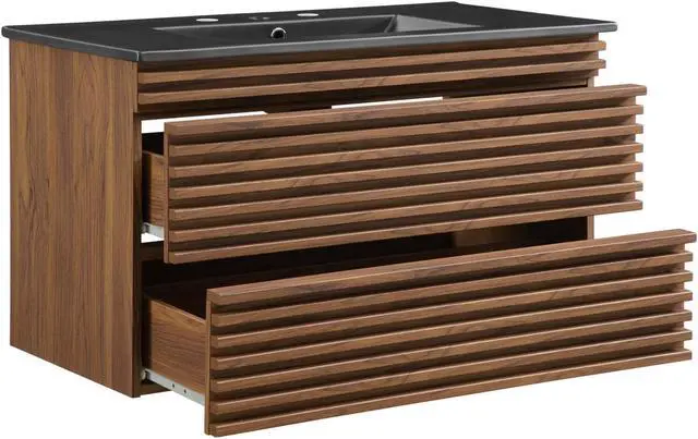 Tap into mid-century aesthetics with the Render Vanity. The Render 36" Bathroom Vanity features a durable MDF and particleboard frame with smooth walnut grain laminate, ample storage space in two full-extension drawers, and a space-saving wall-mount design. Crafted with ceramic, a single sink with an integrated countertop, 8" centerset faucet holes, and rectangular sink basin continues the sleek look of this retro modern vanity. Clean lines and crisp design align for an edgy style designed to meet your needs. Boasting a mid-century modern style this vanity features a solid construction with a pleasing look and practical functionality. Assembly required and fixtures not included. Set Includes: One - 36" Ceramic Basin Top One - 36" Wall standing Vanity cabinet