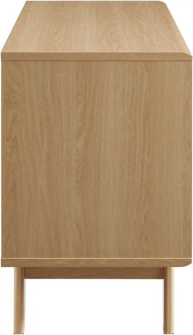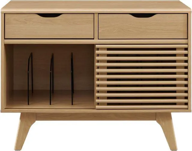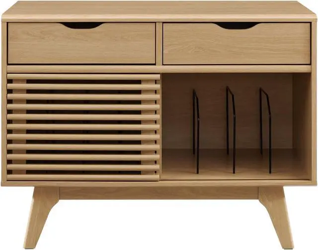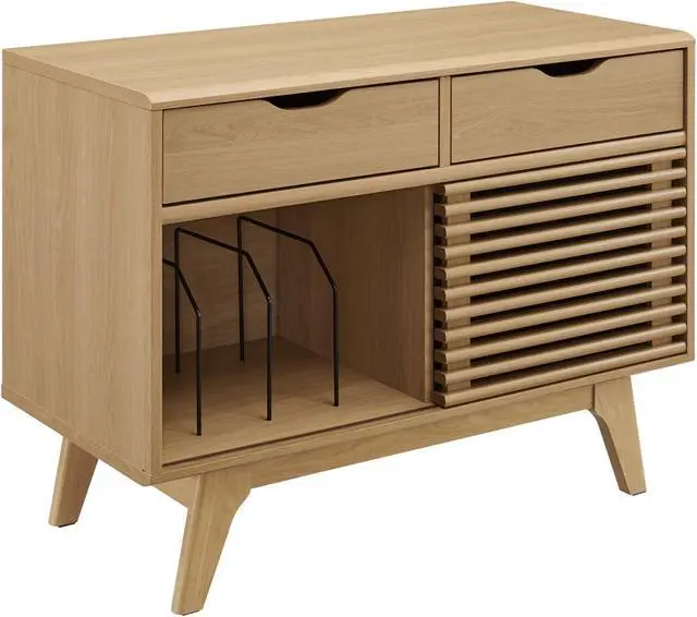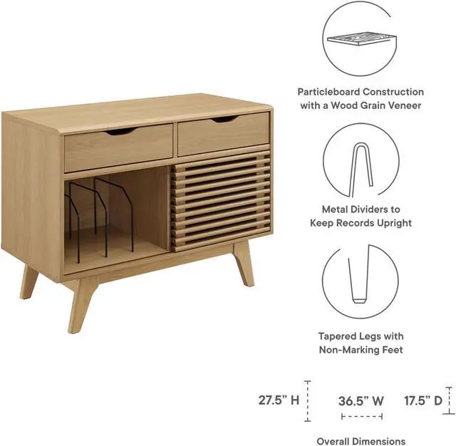 Tap into mid-century aesthetics with the Render Vinyl Record Display Stand. Render features a durable particleboard frame with walnut grain laminate, four tapered wood legs, and non-marking foam foot pads. A sliding slatted door and two top drawers offer ample storage space for your vinyl record collection and media essentials. Complete with metal dividers to keep records standing upright, Renders contemporary linear style is the perfect addition to the modern living room, lounge space, bedroom, or recreation area. Set Includes: One - Render Vinyl Record Display Stand