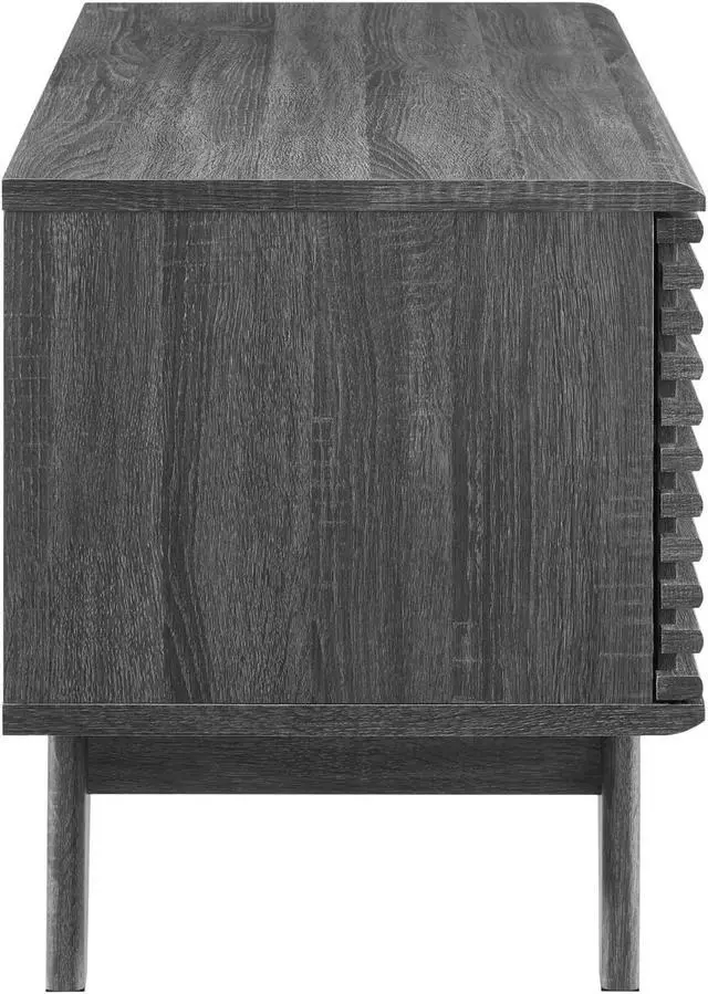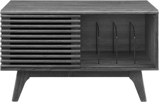 Tap into mid-century aesthetics with the Render Vinyl Record Display Stand. Render features a durable particleboard frame with walnut grain laminate, four tapered wood legs, non-marking foam foot pads, and a sliding slatted door with ample storage space for your vinyl record collection and media essentials. Complete with metal dividers to keep records standing upright, Renders contemporary linear style is the perfect addition to the modern living room, lounge space, bedroom, or recreation area. Set Includes: One - Render Vinyl Record Display Stand