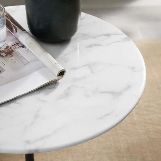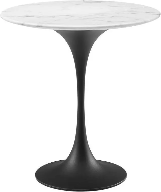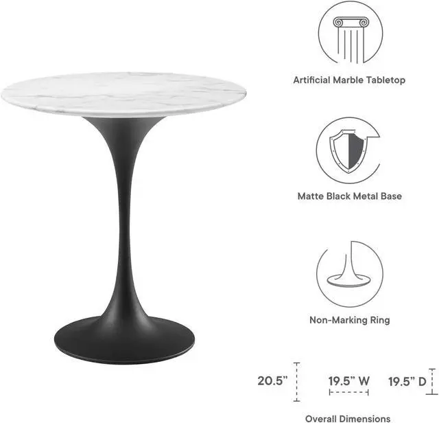 Reflecting a seamless organic shape and timeless form, the Lippa Side Table has become a symbol of modernism for over the past 60 years. Before its release, homes were filled with clunky remnants of an industrial age long gone by. But in order to advance into the new world, homes first had to transition from the traditional square table, into a piece that connoted progress. The base and dimensions are true to the original specifications, while the tables round artificial marble top rests atop a matte black metal tapered pedestal base. Set Includes: One - Lippa 20" Round Artificial Marble Side Table