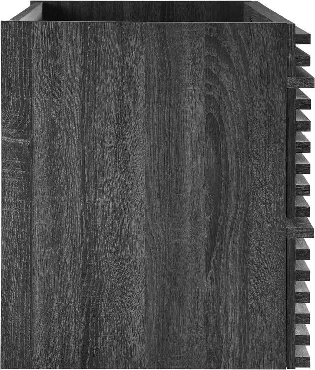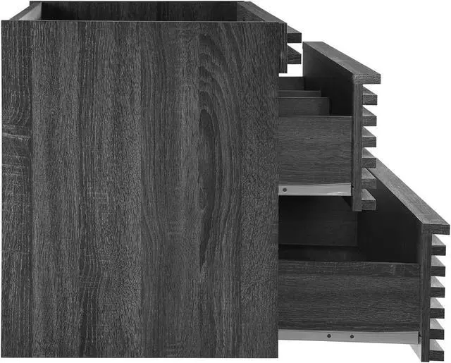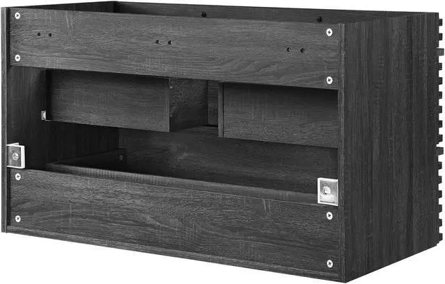 Tap into mid-century aesthetics with the Render Vanity. The Render 36" Bathroom Vanity features a durable MDF and particleboard frame with smooth walnut grain laminate, ample storage space in two full-extension drawers, and a space-saving wall-mount design with a drywall friendly mounting cleat. Crafted with ceramic, a single sink with an integrated countertop, 8" centerset faucet holes, and rectangular sink basin continues the sleek look of this retro modern vanity. Clean lines and crisp design align for an edgy style designed to meet your needs. Boasting a mid-century modern style this vanity features a solid construction with a pleasing look and practical functionality. Assembly required and fixtures not included. Set Includes: One - Render 36" Wall-Mount Bathroom Vanity Cabinet