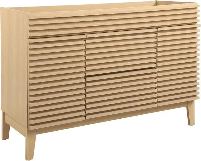 Tap into mid-century aesthetics with the Render 48" Vanity Cabinet. The Render Bathroom Vanity features a durable particleboard frame with a smooth laminate, four tapered wood legs, full extension drawers, and adjustable storage shelves behind soft-close hinged doors. Sleek lines and crisp design align for an edgy style designed to meet your needs. Boasting a mid-century modern style, this vanity features a solid construction with a pleasing look and practical functionality. Assembly required. Sink basin and fixtures not included. Set Includes: One - Render 48" Single Bathroom Vanity Cabinet