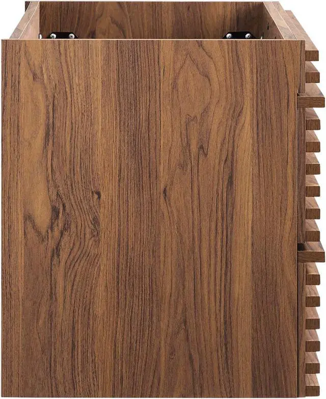 Tap into mid-century aesthetics with the Render Vanity. The Render 36" Bathroom Vanity features a durable MDF and particleboard frame with smooth walnut grain laminate, ample storage space in two full-extension drawers, and a space-saving wall-mount design with a drywall friendly mounting cleat. Crafted with ceramic, a single sink with an integrated countertop, 8" centerset faucet holes, and rectangular sink basin continues the sleek look of this retro modern vanity. Clean lines and crisp design align for an edgy style designed to meet your needs. Boasting a mid-century modern style this vanity features a solid construction with a pleasing look and practical functionality. Assembly required and fixtures not included. Set Includes: One - Render 36" Wall-Mount Bathroom Vanity Cabinet