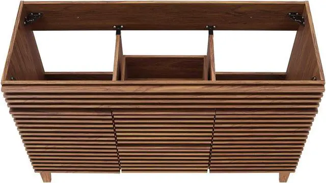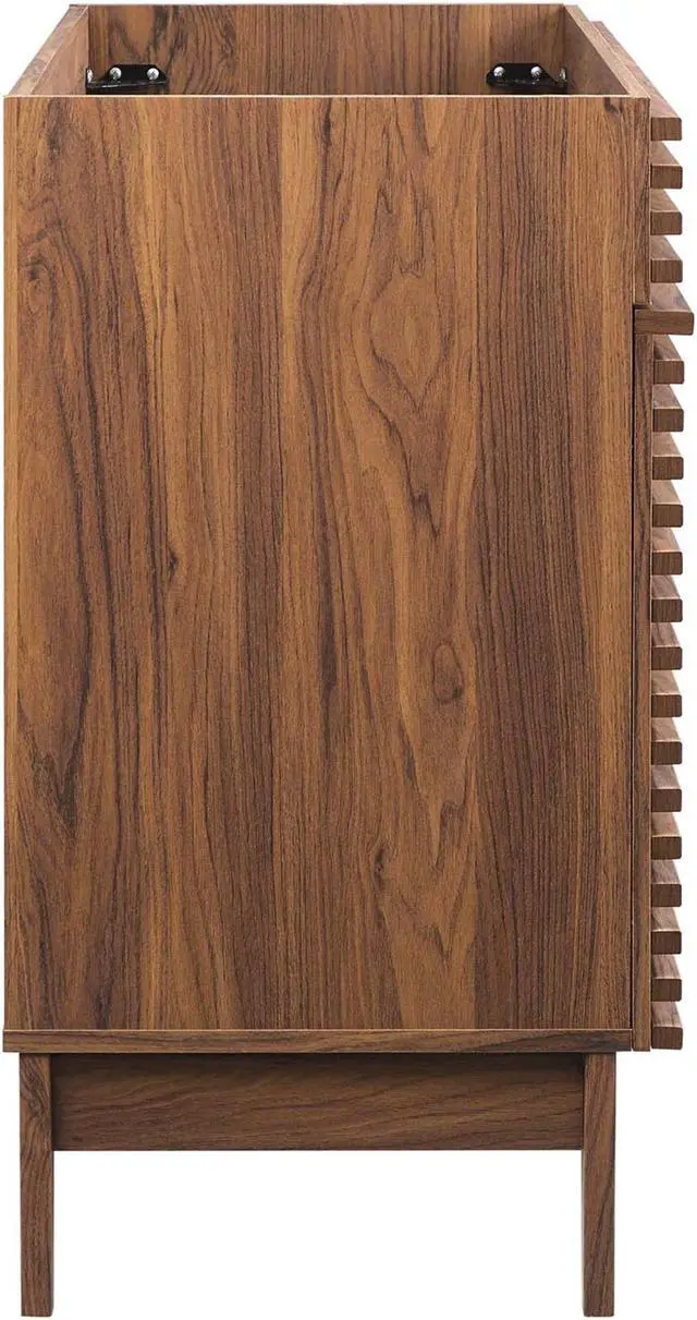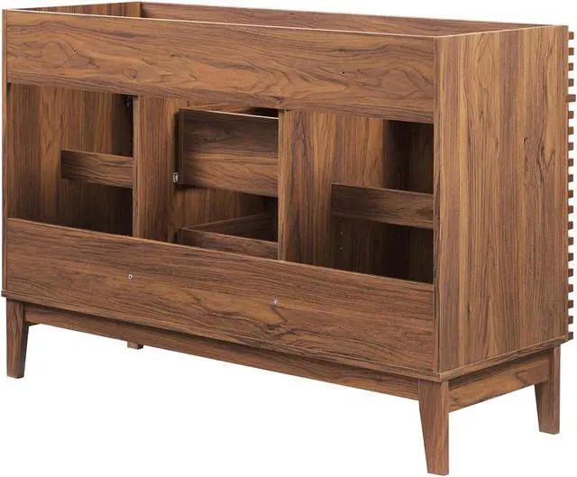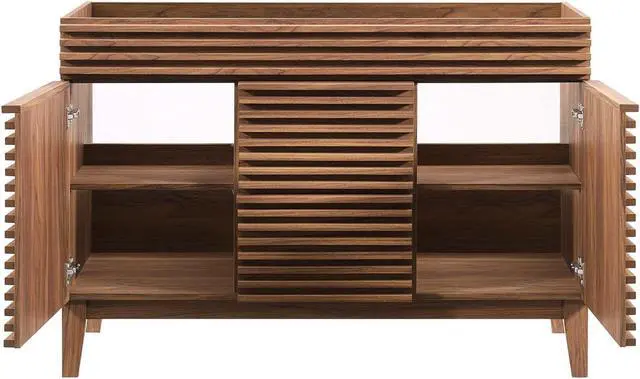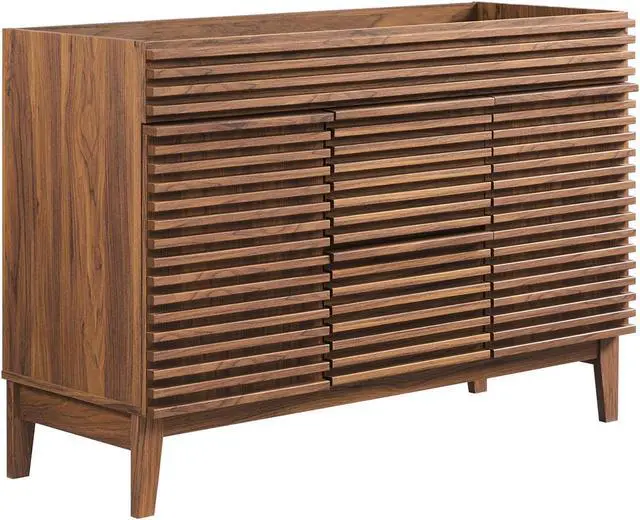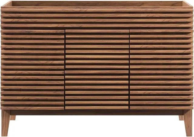 Tap into mid-century aesthetics with the Render Vanity. The Render 48" Bathroom Vanity features a durable MDF and particleboard frame with a smooth laminate, four tapered wood legs, and ample under sink storage space in full-extension drawers and behind soft-close hinged doors. Sleek lines and crisp design align for an edgy style designed to meet your needs. Boasting a mid-century modern style this vanity features a solid construction with a pleasing look and practical functionality. Assembly required. Sink basin and fixtures not included. Set Includes: One - Render 48" Double Bathroom Vanity Cabinet
