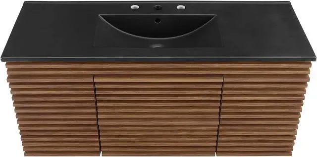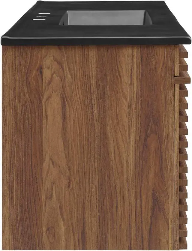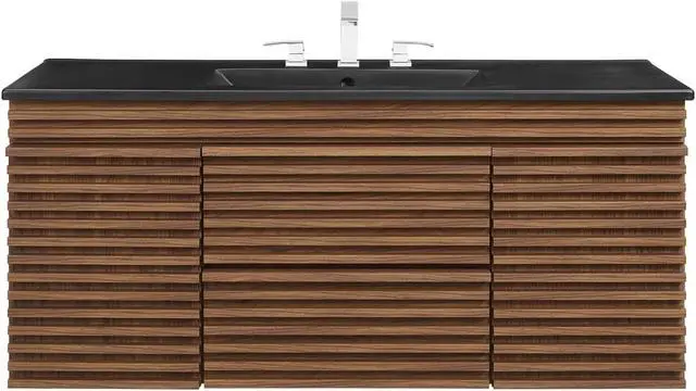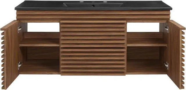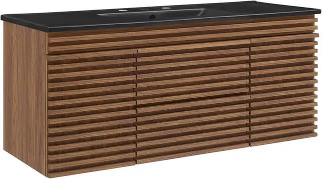 Tap into mid-century aesthetics with the Render Vanity. The Render 48" Single Sink Bathroom Vanity features a durable MDF and particleboard frame with a smooth laminate, ample storage space in two full-extension drawers, adjustable shelves behind soft-close hinged doors, and a space-saving wall-mount design. A curved ceramic basin with an integrated countertop and 8" centerset faucet holes creates sleek lines and a crisp design for an edgy look designed to meet your needs. Boasting a mid-century modern style this vanity features a solid construction with a pleasing look and practical functionality. Assembly required. Fixtures not included. Set Includes: One - 48" Ceramic Basin Top One - 48" Wall-Mount Bathroom Vanity Cabinet
