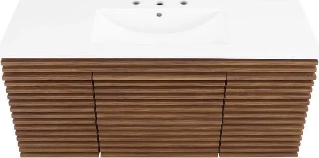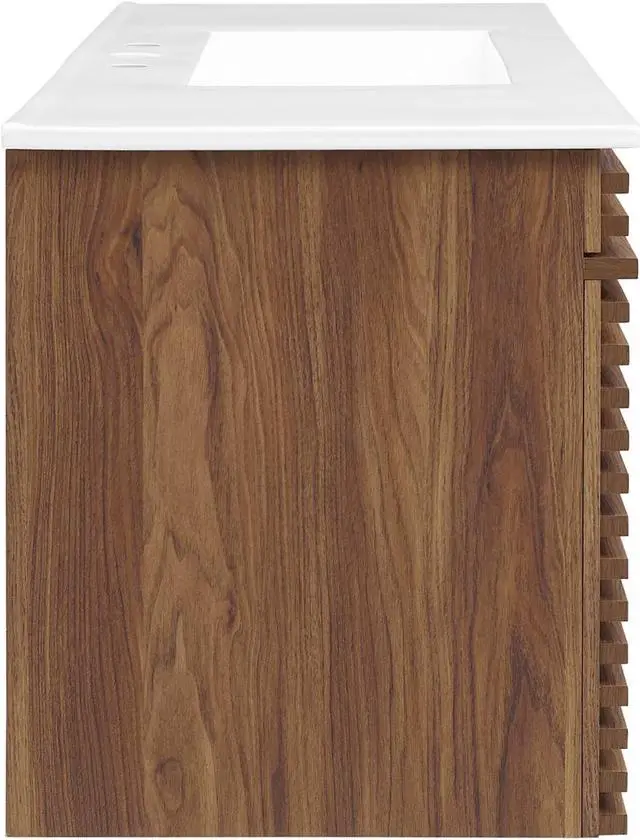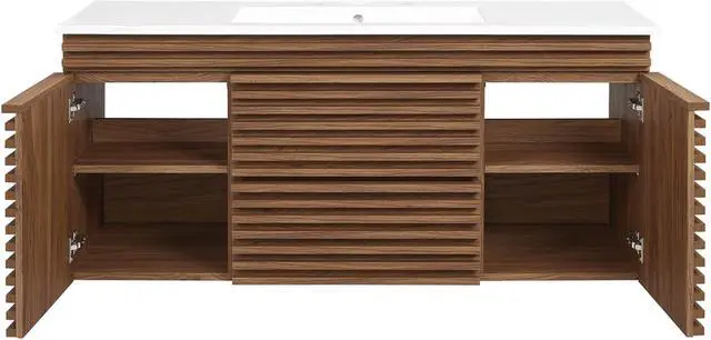 Tap into mid-century aesthetics with the Render Vanity. The Render 48" Single Sink Bathroom Vanity features a durable MDF and particleboard frame with a smooth laminate, ample storage space in two full-extension drawers, adjustable shelves behind soft-close hinged doors, and a space-saving wall-mount design. A curved ceramic basin with an integrated countertop and 8" centerset faucet holes creates sleek lines and a crisp design for an edgy look designed to meet your needs. Boasting a mid-century modern style this vanity features a solid construction with a pleasing look and practical functionality. Assembly required. Fixtures not included. Set Includes: One - 48" Ceramic Basin Top One - 48" Wall-Mount Bathroom Vanity Cabinet
