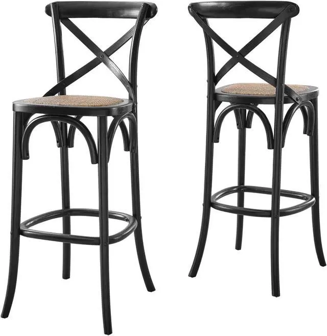Introduce feelings of nostalgia as you gather around the kitchen counter for a quick breakfast or dinner with friends with the Gear Bar Stool. Blending farmhouse charm with modern style, this bar-height stool features an X-brace back and stretchers between splayed legs. With non-marking foot caps to protect flooring, this bar stool is durably crafted with durable elm wood for a sturdy construction built to last. Make a statement in your dining space or kitchen area with this versatile wood bar stool that is complete with a woven rattan seat for added interest. Weight Capacity: 330 lbs., Set Includes : One - Gear Bar Stool