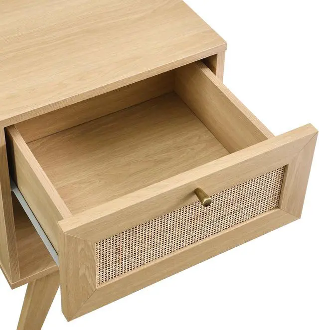 Introduce refreshing style to a primary or guest bedroom with the Soma 1-Drawer Nightstand. Showcasing a beautiful rattan weave on the squared drawer front, this nightstand brings organic aesthetics and modern functionality to a bedroom space or living area when used as a side table. This accent table is crafted from durable MDF and particleboard with a natural wood grain finish. This bedside table is complete with a full-extension glide drawer to help conceal bedside essentials and features an open shelving area that can be used for both storage and display. Resting on splayed legs, Soma includes non-marking foot pads to protect flooring. Assembly required., Set Includes : One - Soma 1-Drawer Nightstand