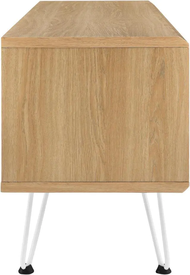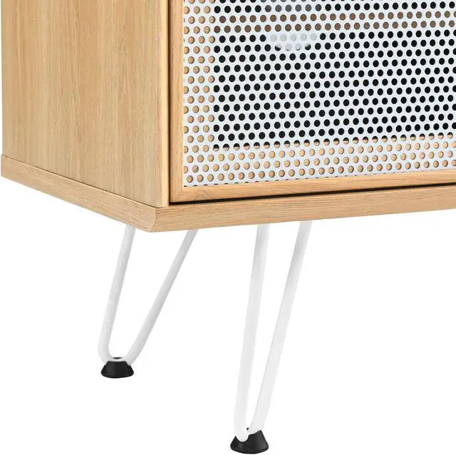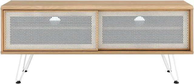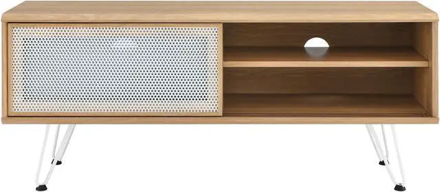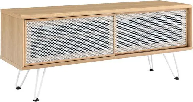 Urbanize your living space with the modern style of the Nomad 47" TV Stand. Featuring two sliding metal mesh doors, this entertainment center brings organic aesthetics and industrial design to the living room, bedroom, home office, or lounge area. This media stand is crafted with a honeycomb core and wood grain laminate. Resting on splayed hairpin legs with non-marking rubber pads, this media stand offers ample storage space for all your media essentials with spacious shelving while cable management holes keep visual space clean and allow for flow-through ventilation. This TV center accommodates TVs up to 52". Assembly required. Weight Capacity: 200 lbs., Set Includes : One - TV Stand