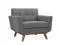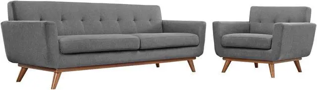 Gently sloping curves and large dual cushions create a favorite lounging spot. Whether plopping down after a long day at work, settling in with coffee and brunch, or entering a spirited discussion with friends, the Engage sofa is a welcome presence in your home. Seven tufted buttons create eye-catching appeal, adding depth that brings your sitting dcor to center stage. Four cherry color rubberwood legs and frame supply a solid base to the comfortable upholstered material.Set Includes:One - Engage Armchair with wood LegsOne - Engage Sofa with wood legs