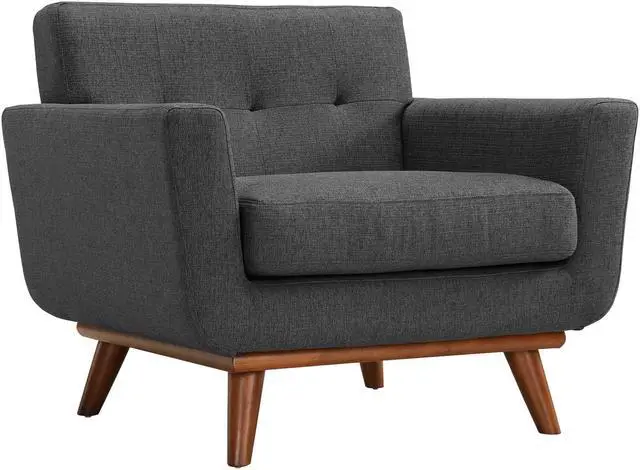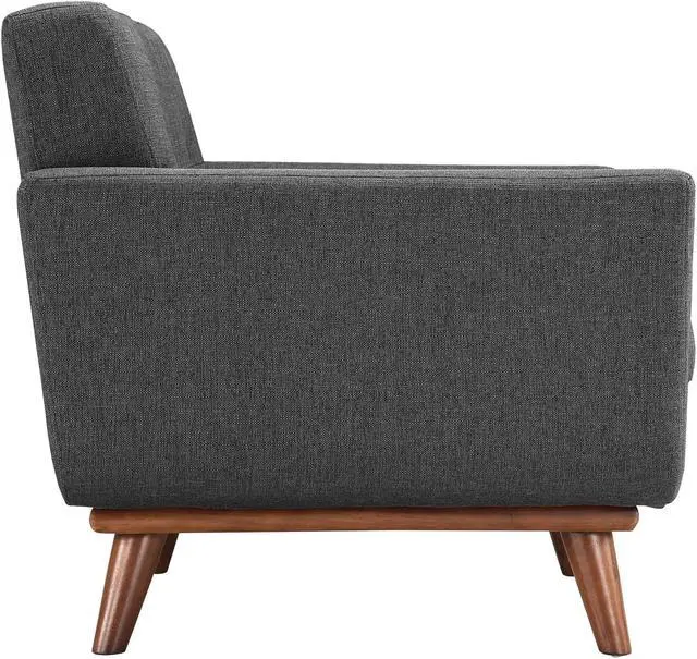 Gently sloping curves and large dual cushions create a favorite lounging spot. Whether plopping down after a long day at work, settling in with coffee and brunch, or entering a spirited discussion with friends, the Engage sofa is a welcome presence in your home. Seven tufted buttons create eye-catching appeal, adding depth that brings your sitting dcor to center stage. Four cherry color rubberwood legs and frame supply a solid base to the comfortable upholstered material.Set Includes:One - Engage Sofa with wood legsTwo - Engage Armchairs with wood Legs