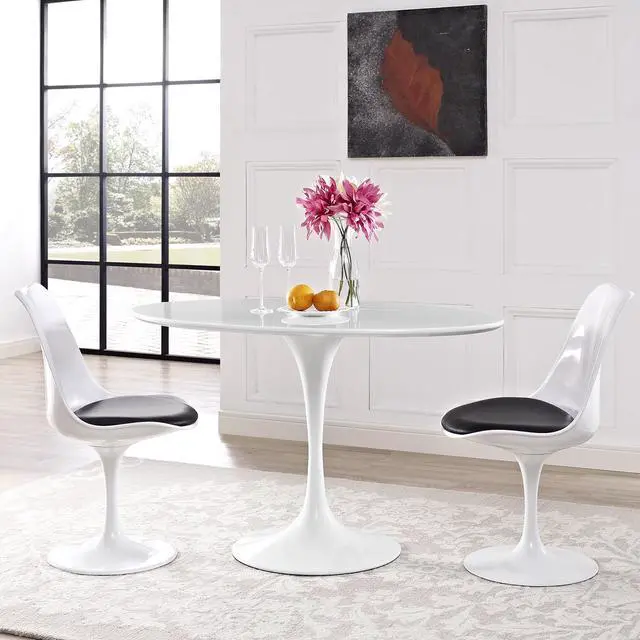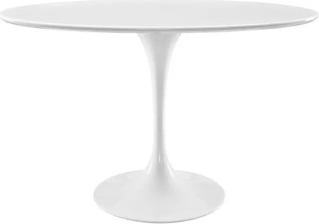 Reflecting a seamless organic shape and timeless form, the Lippa dining table has become a symbol of modernism for over the past 60 years. Before its release, homes were filled with clunky remnants of an industrial age long gone by. But in order to advance into the new world, homes first had to transition from the traditional square table, into a piece that connoted progress. The base and dimensions are true to the original specifications, while the tables circular white top and metal tapered base are carefully lacquered with a chip-resistant finish.Set Includes:One - Lippa 48" Dining Table