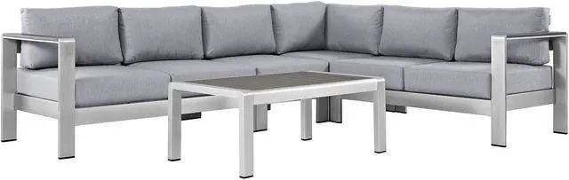 Enjoy your patio or backyard leisure time with the strong and durable Shore Outdoor Aluminum Collection. Made of anodized brushed aluminum frames and non-marking black plastic foot caps, Shore pieces come outfitted with resilient fabric canvas tested to last through all weather conditions. The Shore Outdoor Aluminum Collection complements casual gatherings with a chic look and ready versatility you can rely on.Set Includes:One - Shore Armless ChairOne - Shore Coffee TableOne - Shore Corner SofaOne - Shore Left-Arm Corner Sectional LoveseatOne - Shore Right-Arm Loveseat