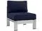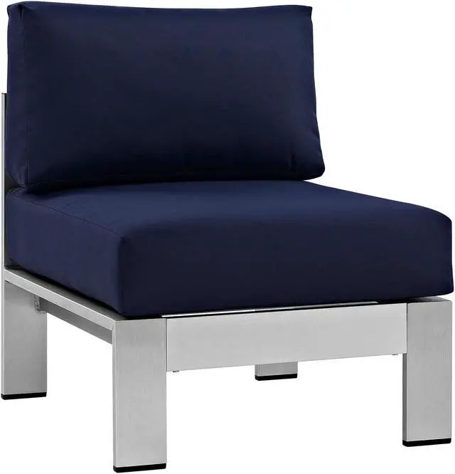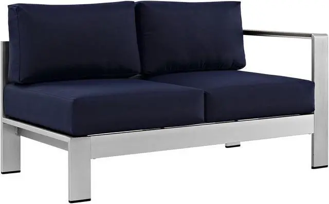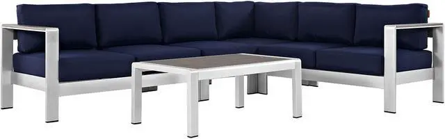 Enjoy your patio or backyard leisure time with the strong and durable Shore Outdoor Aluminum Collection. Made of anodized brushed aluminum frames and non-marking black plastic foot caps, Shore pieces come outfitted with resilient fabric canvas tested to last through all weather conditions. The Shore Outdoor Aluminum Collection complements casual gatherings with a chic look and ready versatility you can rely on.Set Includes:One - Shore Armless ChairOne - Shore Coffee TableOne - Shore Corner SofaOne - Shore Left-Arm Corner Sectional LoveseatOne - Shore Right-Arm Loveseat