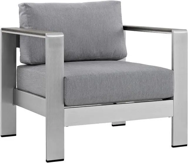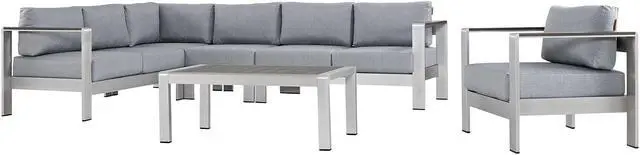 Enjoy your patio or backyard leisure time with the strong and durable Shore Outdoor Aluminum Collection. Made of anodized brushed aluminum frames and non-marking black plastic foot caps, Shore pieces come outfitted with resilient fabric canvas tested to last through all weather conditions. The Shore Outdoor Aluminum Collection complements casual gatherings with a chic look and ready versatility you can rely on.Set Includes:One - Shore ArmchairOne - Shore Armless ChairOne - Shore Coffee TableOne - Shore Corner SofaOne - Shore Left-Arm Corner Sectional LoveseatOne - Shore Right-Arm Loveseat