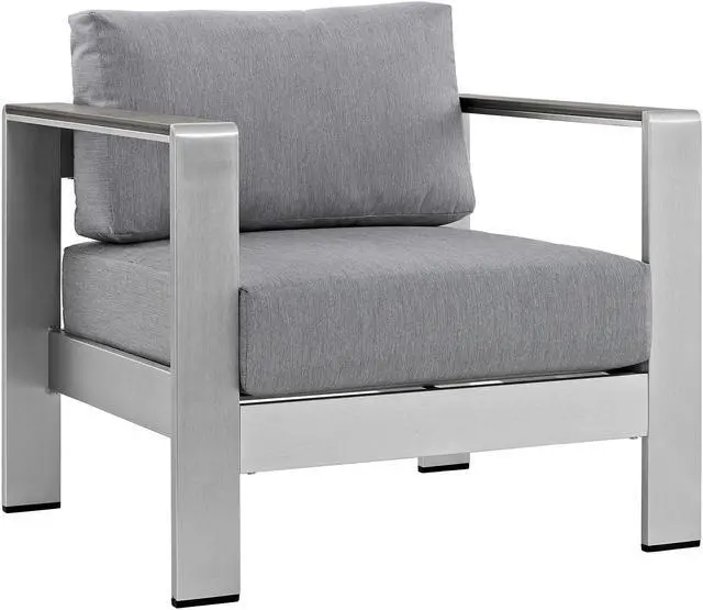 Enjoy your patio or backyard leisure time with the strong and durable Shore Outdoor Aluminum Collection. Made of anodized brushed aluminum frames and non-marking black plastic foot caps, Shore pieces come outfitted with resilient fabric canvas tested to last through all weather conditions. The Shore Outdoor Aluminum Collection complements casual gatherings with a chic look and ready versatility you can rely on.Set Includes:One - Shore Coffee TableOne - Shore LoveseatTwo - Shore ArmchairTwo - Shore Side Table