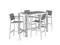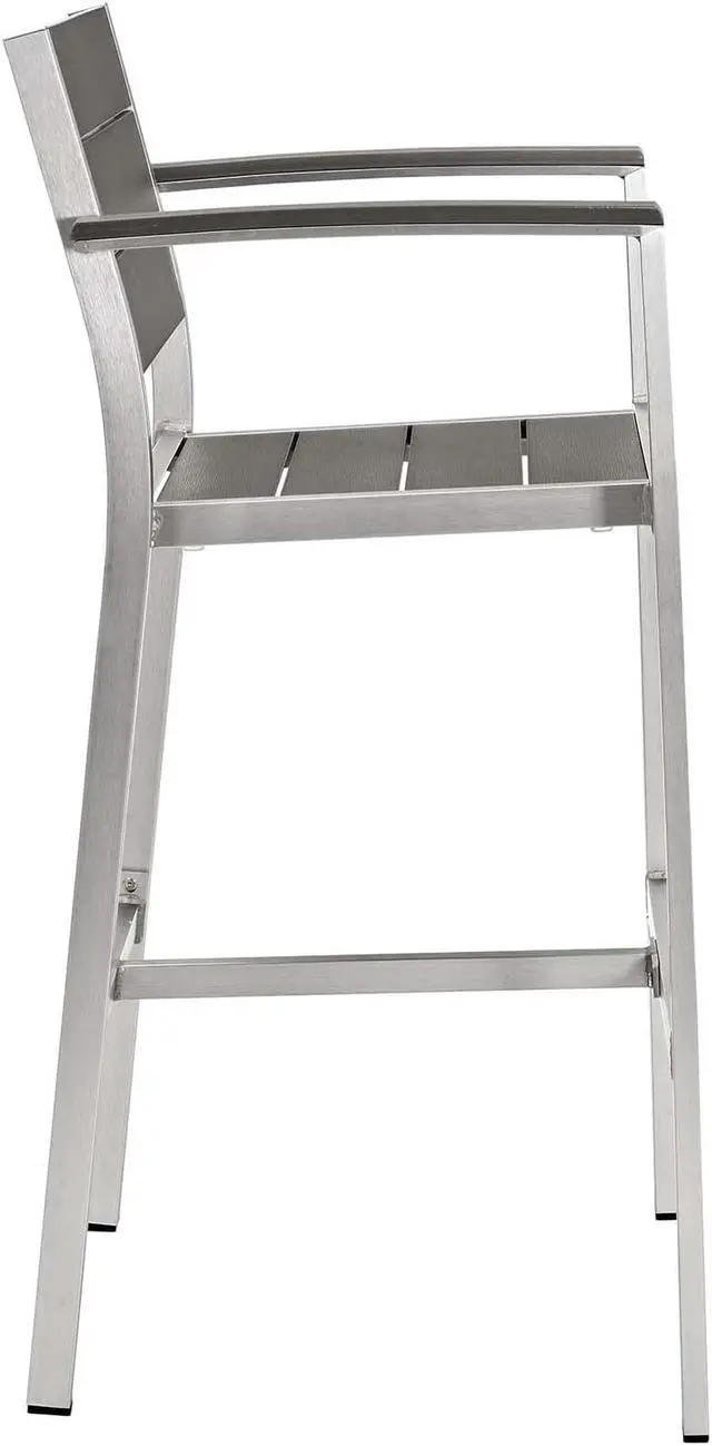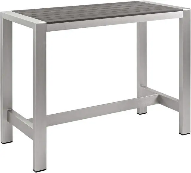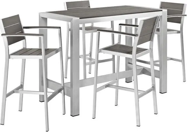 Enjoy your patio or backyard leisure time with the strong and durable Shore Outdoor Aluminum Dining Set. Made with an anodized brushed aluminum frame, sturdy footrest, and non-marking black plastic foot caps, Shore features tone-on-tone grays with wood accents on the paneling for a chic and minimalist look. The Shore Outdoor Aluminum Dining Set complements your casual gatherings with a look and functionality that you can rely on.Set Includes:Four - Shore Bar StoolOne - Shore Bar Table