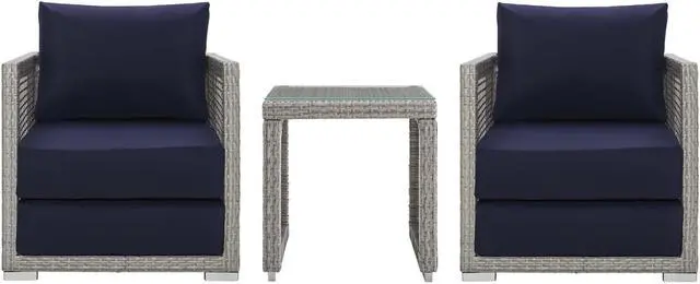 Modern Outdoor Patio CollectionGray Synthetic PE Wicker RattanPlush All-Weather CushionsPowder Coated Aluminum Frame"Fade, Water and UV Resistant"Chrome Plated Anti-Skid FeetChair Weight Capacity: 331 lbs.Assembly RequiredOverall Armchair Dimensions: 27.5"L x 32"W x 32"HSeat Dimensions: 22"L x 23.5"W x 15.5"HArmrest Dimensions: 32"L x 27.5"W x 25.5"HOverall Side Table Dimensions: 16"L x 18"W x 17.5"HOverall Product Dimensions: 27.5"L x 82"W x 32"HProduct Materials: Legs: PP,L shaped, plated, size 100*100*25mm; the bottom is anti-skid; rattan is FB88WK1784-36L, the 2 sides color is same, Chair Weight Capacity: 150kgs.