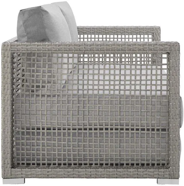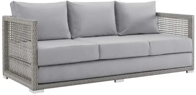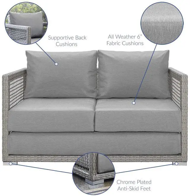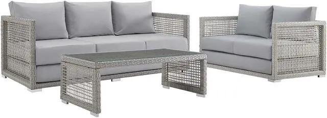 Weave conversational threads into a rollicking good time with Aura Outdoor Patio Collection. Aura comes with a synthetic gray-on-gray tone wicker rattan weave and a powder-coated aluminum frame that delivers a softly versatile outdoor collection that shifts to meet the needs of the moment. Outfitted with machine washable and fade resistant all-weather fabric cushions, and designed with an extra wide and deep body, Aura will make your outdoor spot the focal point of good memories and festive gatherings while enhancing your patio, backyard or poolside arena. Featuring thick cushions and chrome plated anti-skid feet, enjoy spacious seating and enhanced comfort with this reliable piece of outdoor furniture. Comes fully assembled.Set Includes:One - Aura Coffee TableOne - Aura LoveseatOne - Aura Sofa