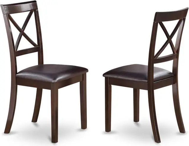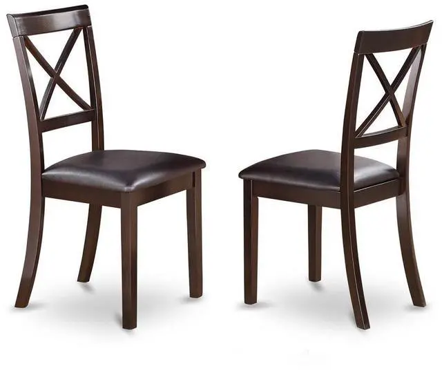Slender X back kitchen chairs present trendy and comfortable seating, with Faux leather seats combined with Cappuccino finish which let you enjoy a nice and trendy dining experience. Dining room chairs seats in Faux leather seat to fit taste and desired design