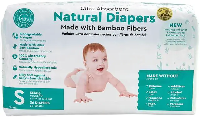 Our new generation of bamboo fiber diapers haseverything you love about our diapers but also featuresstronger reinforced tabsand awetness indicator. Since Little Toes Ultra Absorbent NaturalDiapers are made from bamboo fibers, they arenaturally hypoallergenic, antibacterial, antimicrobial and biodegradable.